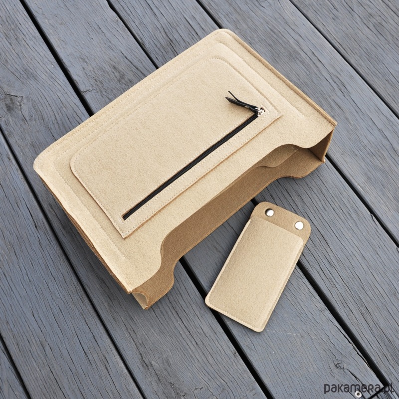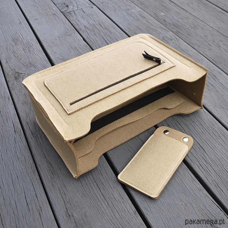 Wyprofilowany, filcowy organizer do torebki to znakomite rozwiązanie na uporządkowanie wszystkiego co nosimy w luźnej torebce. Uszyliśmy go z wysokiej jakości filcu w 100% poliestrowego, specjalnie zabezpieczonego przed mechaceniem się. Usztywni wnętrze i spód torebki. W środku znajdziemy 4 wygodne i praktyczne kieszonki. Na jednej z nich zamontowana szeroka czarna guma. Jeden uchwyt na wodę. Po drugiej stronie filcowego organizera znajdziemy odczepiane etui na długopisy. Na zewnątrz kieszeń na zamek. Suwak ozdobiony czarną skórą naturalną. Istnieje oczywiście możliwość zamówienia organizera do torebki o innych wymiarach.