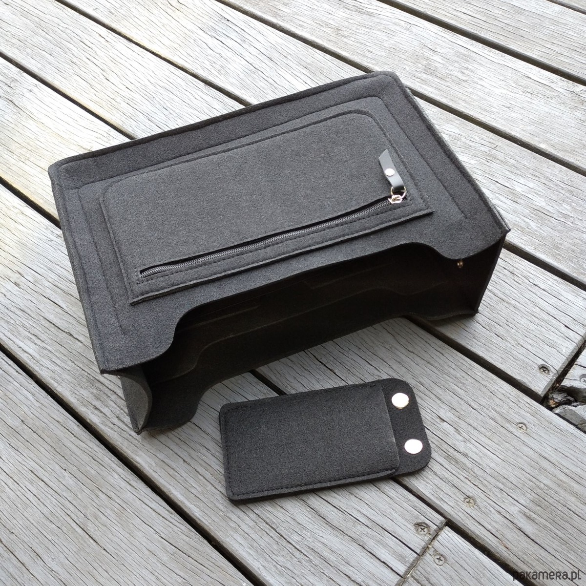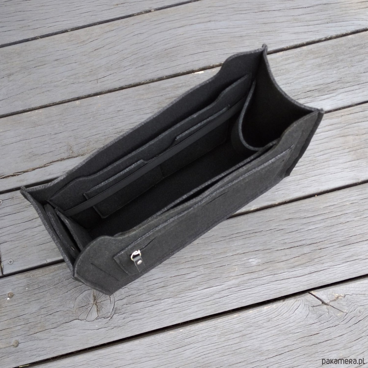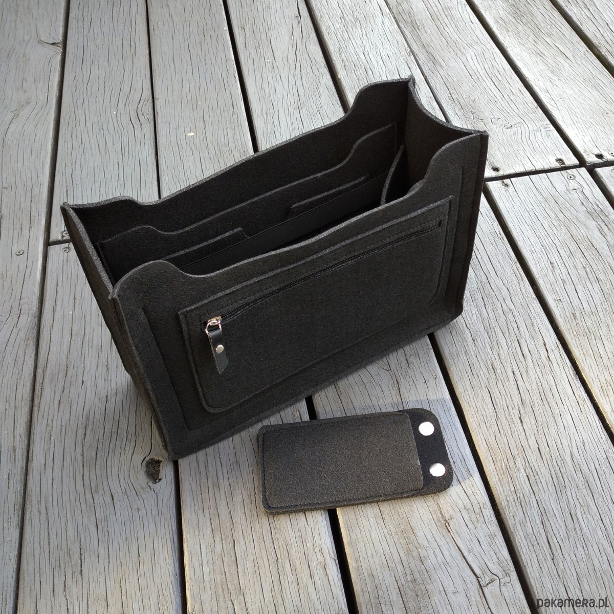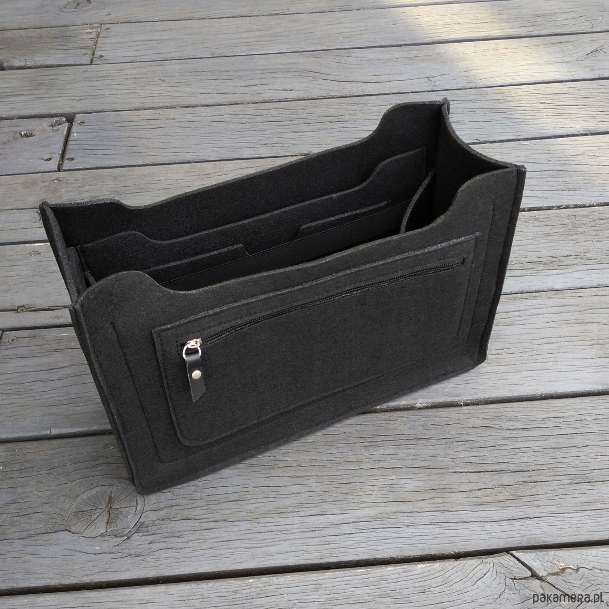 Wyprofilowany, filcowy organizer do torebki to znakomite rozwiązanie na uporządkowanie wszystkiego co nosimy w luźnej torebce. Uszyliśmy go z wysokiej jakości filcu w 100% poliestrowego, specjalnie zabezpieczonego przed mechaceniem się. Usztywni wnętrze i spód torebki. W środku znajdziemy 4 wygodne i praktyczne kieszonki. Na jednej z nich zamontowana szeroka czarna guma. Jeden uchwyt na wodę. Po drugiej stronie filcowego organizera znajdziemy odczepiane etui na długopisy. Na zewnątrz kieszeń na zamek. Suwak ozdobiony czarną skórą naturalną. Istnieje oczywiście możliwość zamówienia organizera do torebki o innych wymiarach.