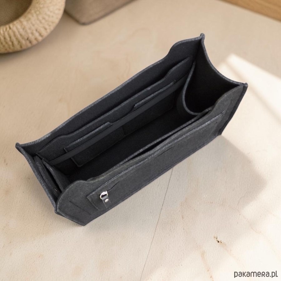 Wyprofilowany, filcowy organizer do torebki to znakomite rozwiązanie na uporządkowanie wszystkiego co nosimy w luźnej torebce. Uszyliśmy go z wysokiej jakości filcu w 100% poliestrowego, specjalnie zabezpieczonego przed mechaceniem się. Usztywni wnętrze i spód torebki. W środku znajdziemy 4 wygodne i praktyczne kieszonki. Na jednej z nich zamontowana szeroka czarna guma. Jeden uchwyt na wodę. Po drugiej stronie filcowego organizera znajdziemy odczepiane etui na długopisy. Na zewnątrz kieszeń na zamek. Suwak ozdobiony czarną skórą naturalną. Istnieje oczywiście możliwość zamówienia organizera do torebki o innych wymiarach.