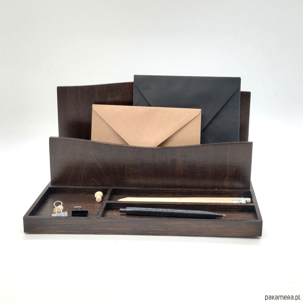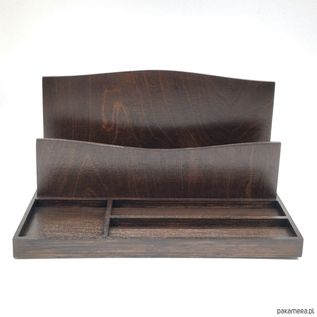 Organizer wykonany jest z drewnianej sklejki, malowany na ciemny brąz.