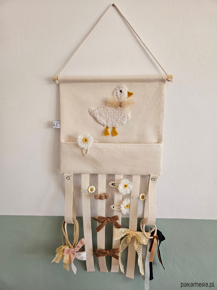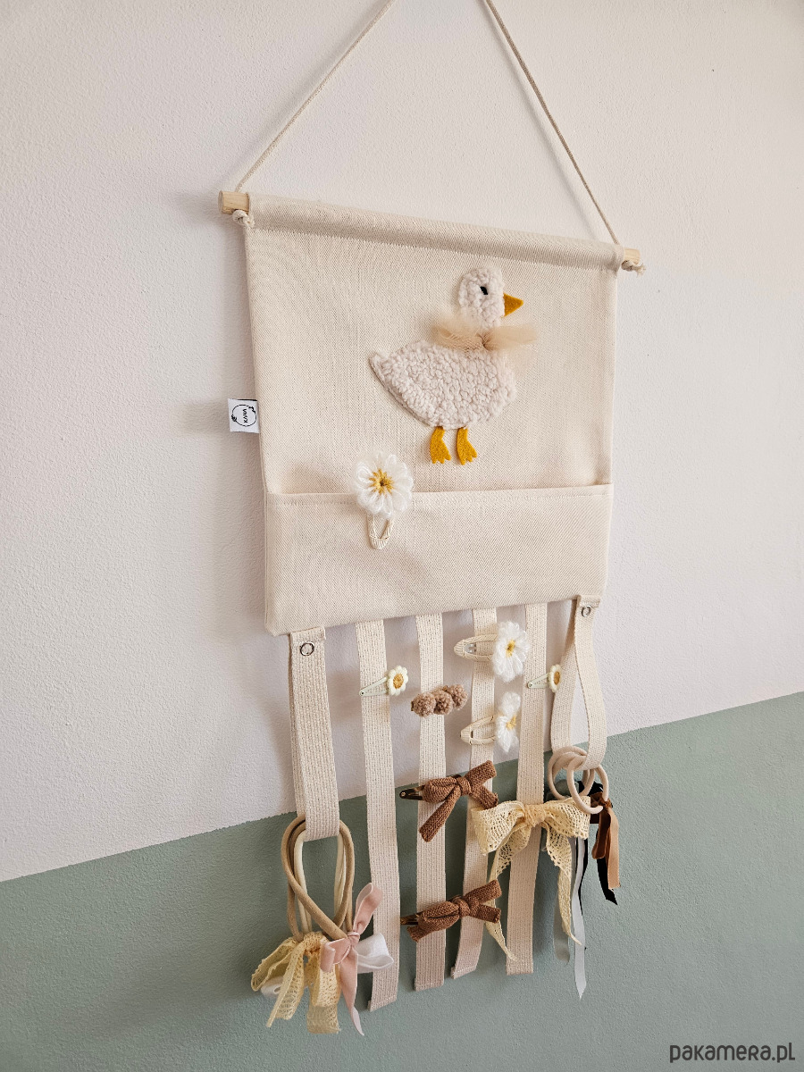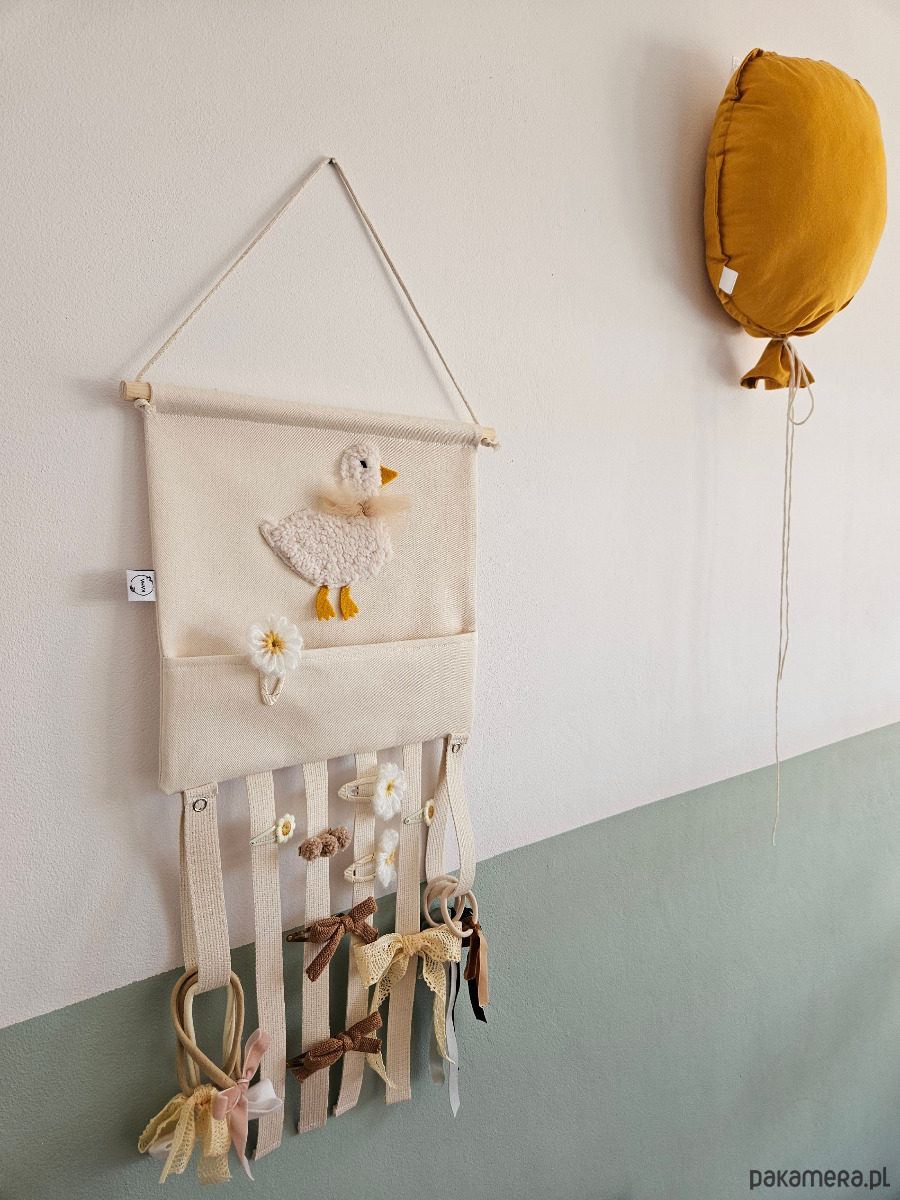 Organizer uszyty jest z grubej, surowej bawełny, co zapewnia jego wytrzymałość. Aplikacja z miękkiej tkaniny nadaje mu wyjątkowego, skandynawskiego stylu. Świetnie komponuje się w pokoju urządzonym w duchu Montessori.