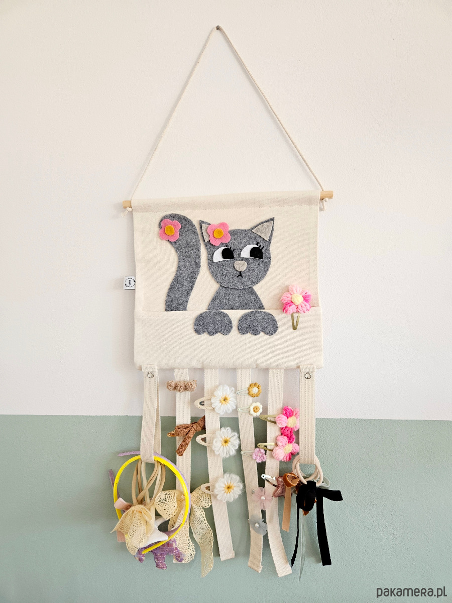 Organizer uszyty jest z grubej, surowej bawełny, co zapewnia jego wytrzymałość. Ręcznie wyszywana aplikacja z filcu nadaje mu wyjątkowego, skandynawskiego stylu. Świetnie komponuje się w pokoju urządzonym w duchu Montessori.