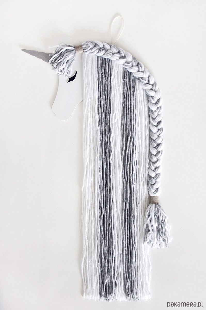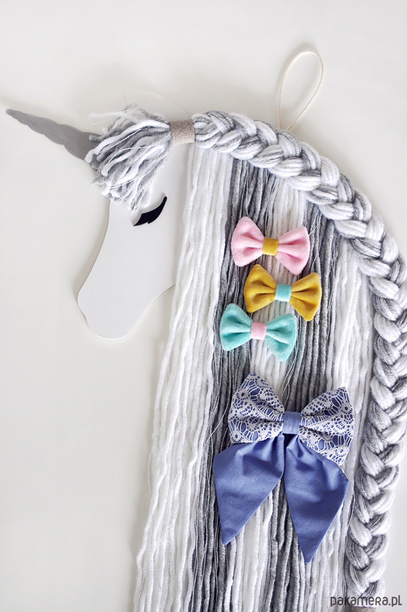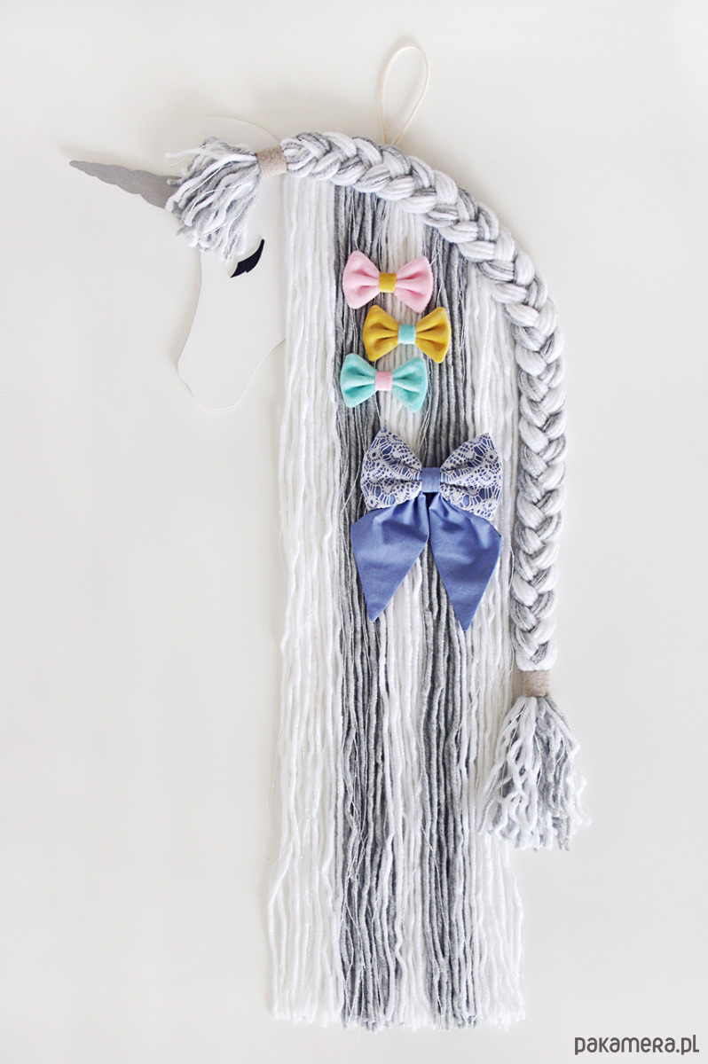 Dekoracyjny organizer na spinki do włosów w kształcie głowy jednorożca jest nie tylko pięknym akcentem w pokoju dziecka, ale również praktycznym akcesorium. Można na nim przechowywać spinki, gumki, a warkocz sprytnie pomieści opaski.