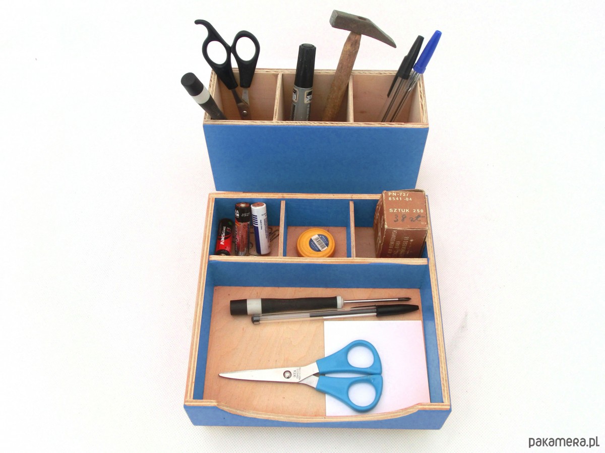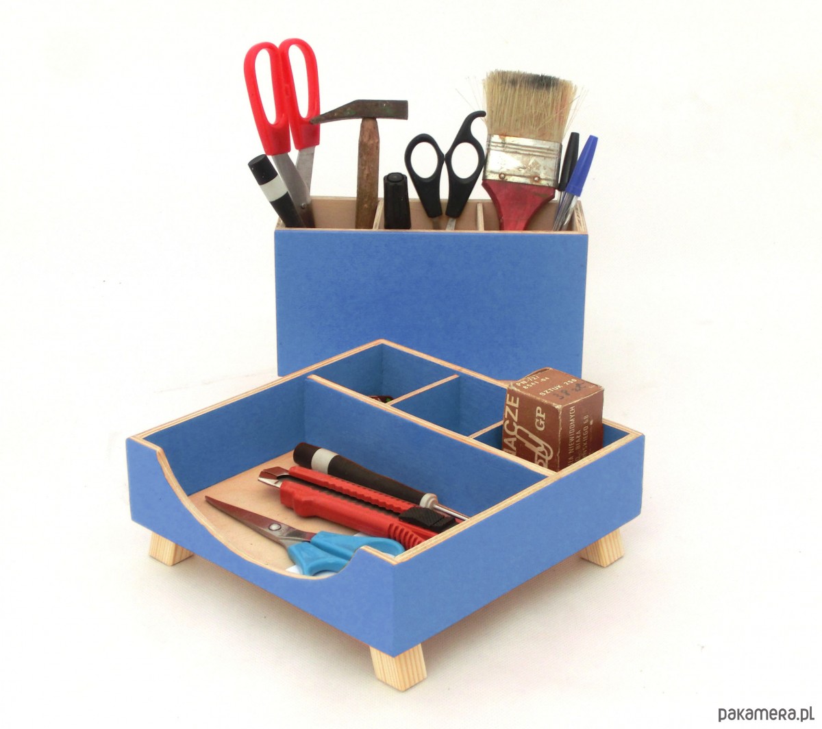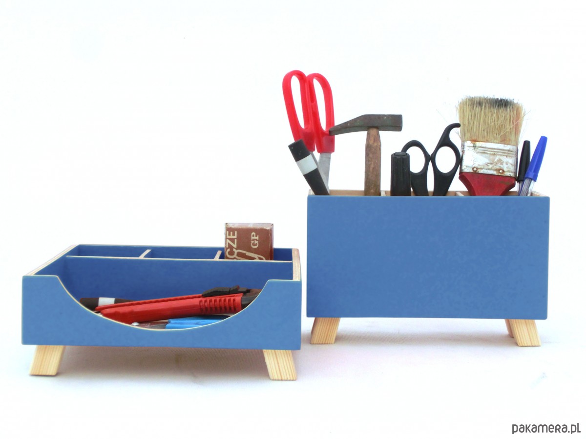 Zestaw dwóch pojemników do organizacji biurka. W całości wykonany ze sklejki drewnianej i pomalowany farbami akrylowymi. Zestaw można skomponować z zegarami. Rozmiar: niskie pudełko 20cm x 20cm x 7cm wysokie pudełko 20cm x 7cm x 12,5cm
