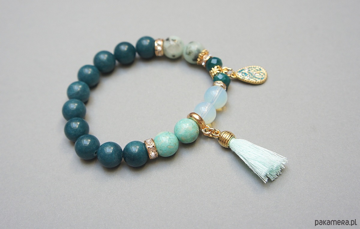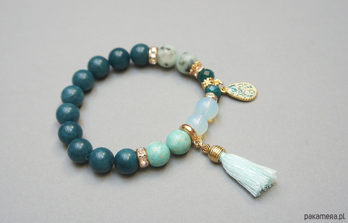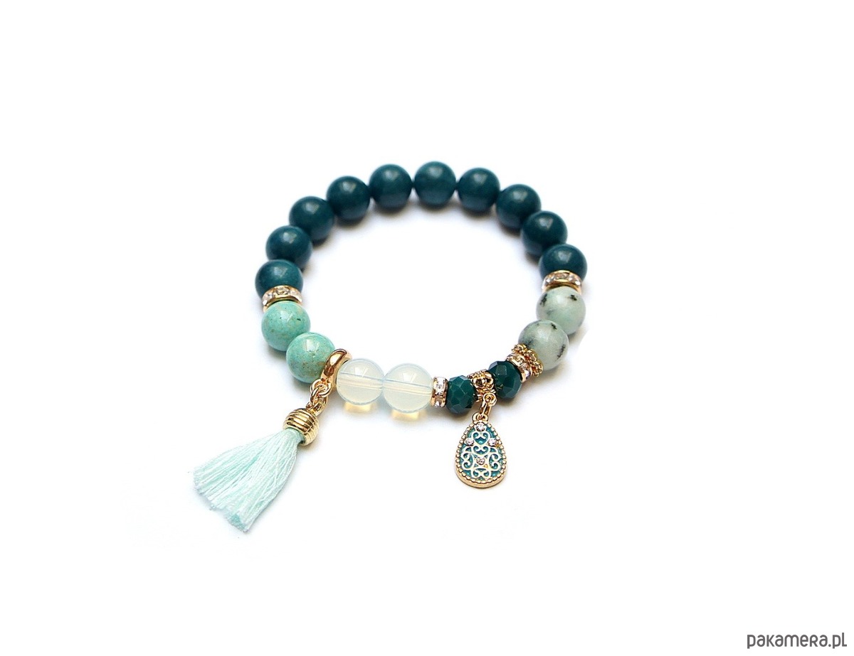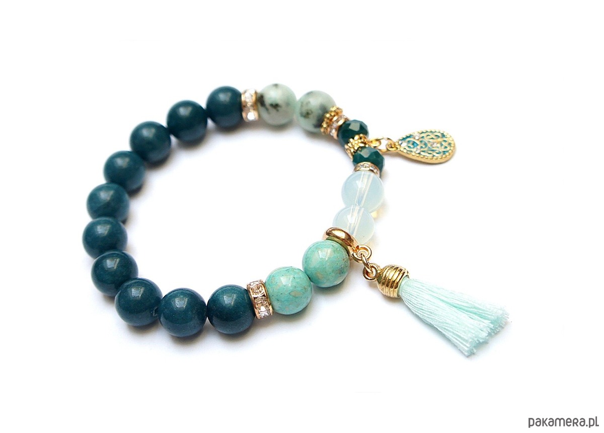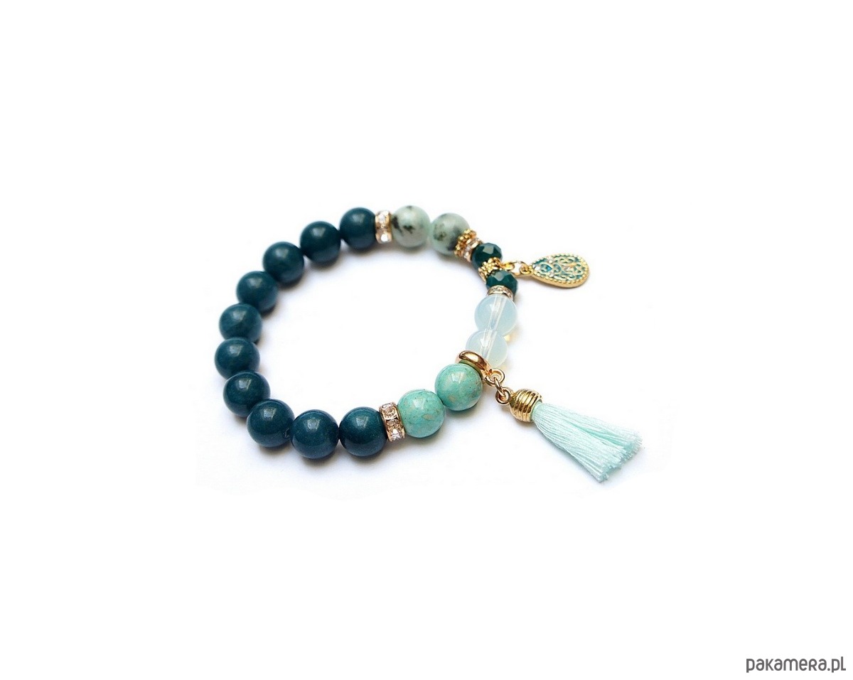 Bransoletka wykonana z naturalnych minerałów - jaspis [10mm], marmur [10mm], kryształki fasetowane [8mm], transparentne szklane kuleczki [10mm], zawieszki emaliowanej, wysadzanej cyrkoniami, chwostu oraz elementów metalowych w kolorze złotym. Bransoletka na gumce silikonowej. Pasuje na nadgarstek 16-17cm. Biżuteria ozdobnie zapakowana.
