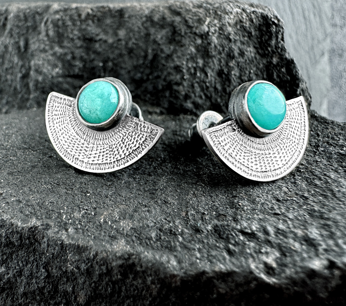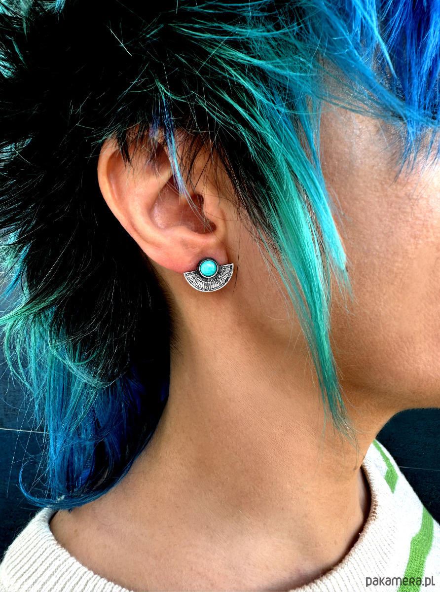 Oryginalne, kobiece kolczyki wykonane zostały z oksydowanego srebra próby 925 oraz naturalnego kamienia amazonitu o turkusowym zabarwieniu. Lekkie i komfortowe w noszeniu, będą dyskretnym dodatkiem zarówno do casualowych jak i eleganckich kreacji. Polecamy w komplecie z pierścionkiem lub wisiorkiem z kolekcji KISS OF ORIENT.
