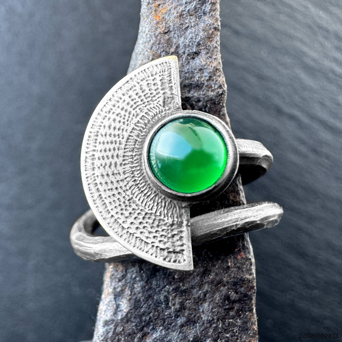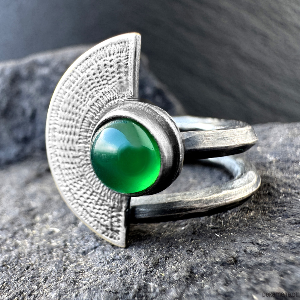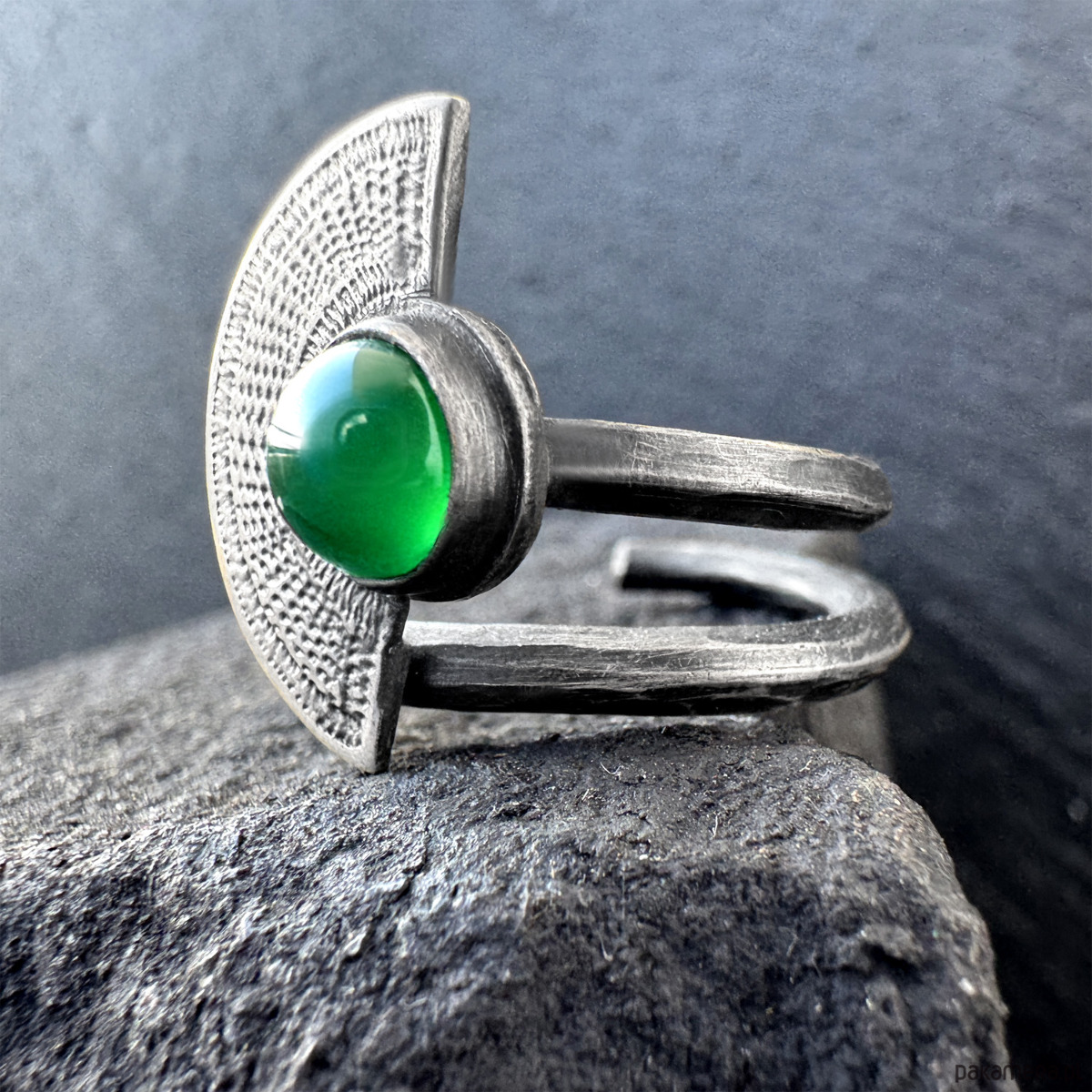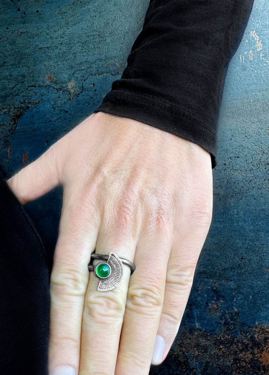 Orientalny pierścionek wachlarz z zielonym onyksem