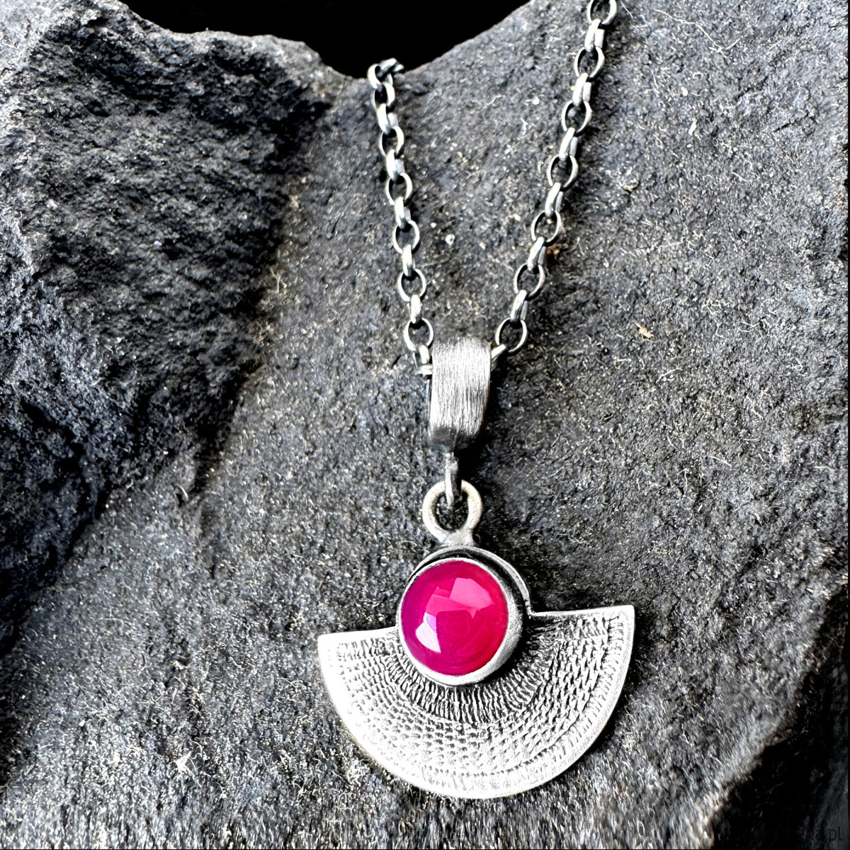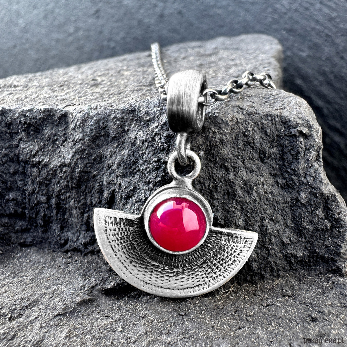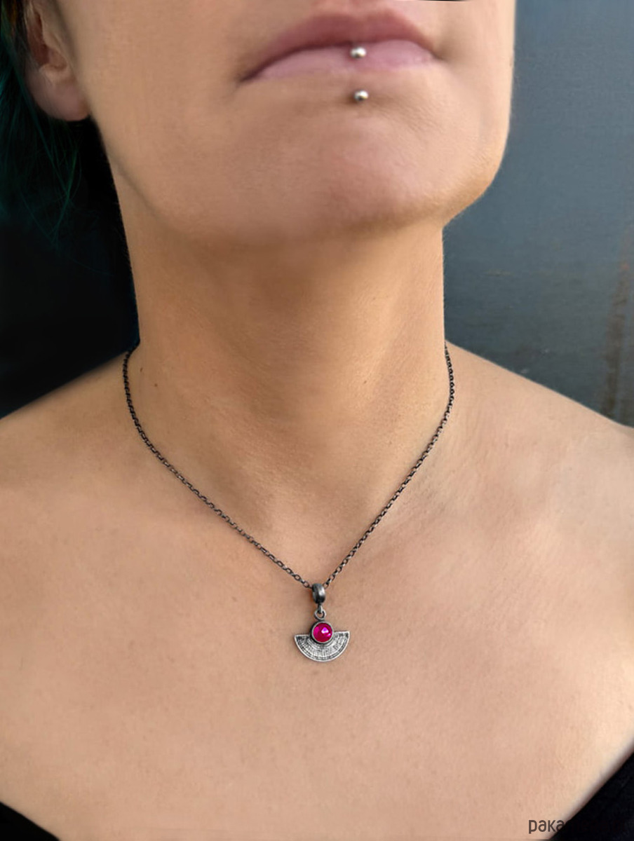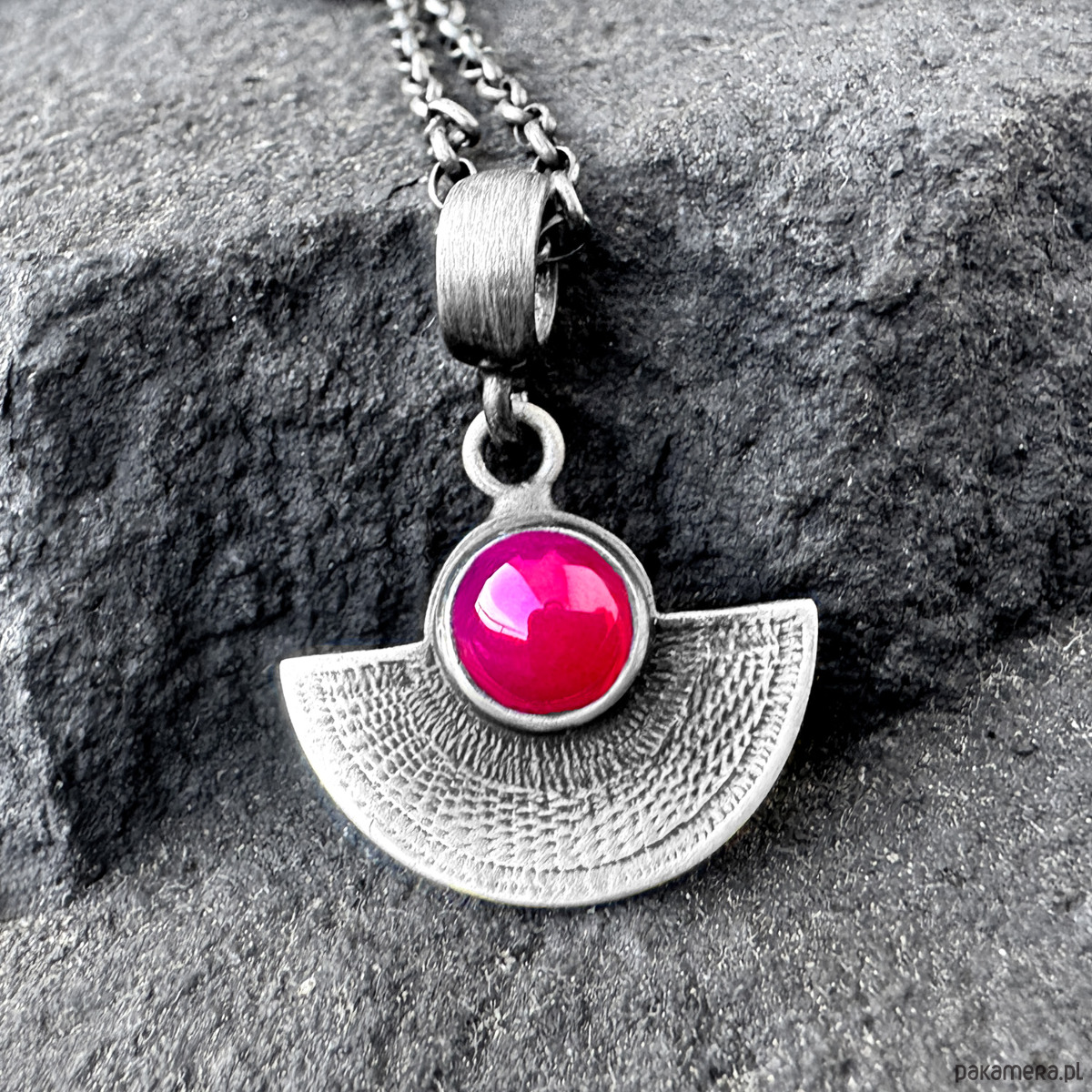 Subtelna zawieszka z kolekcji "KISS OF ORIENT" wykonana została z oksydowanego srebra próby 925 oraz onyksu w kolorze soczystej fuksji. Polecamy jako dodatek do kolczyków lub pierścionka z tej samej linii.