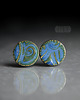 Ceramiczne okrągłe kolczyki w formie sztyftów, ręcznie wykonane z delikatnej jasnobeżowej gliny kamionkowej, dekorowane wgłębnym reliefem, szkliwione zielono błękitnym szkliwem,na antyalergicznych sztyftach ze stali chirurgicznej w kolorze srebrnym.wykonywane na zamówienie - rozmieszczenie wzoru może nieco różnić się od widocznego na zdjęciu.Średnica ok. 11mm.. Polecam