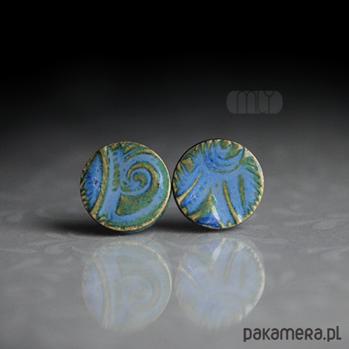 Ceramiczne okrągłe kolczyki w formie sztyftów, ręcznie wykonane z delikatnej jasnobeżowej gliny kamionkowej, dekorowane wgłębnym reliefem, szkliwione zielono błękitnym szkliwem,na antyalergicznych sztyftach ze stali chirurgicznej w kolorze srebrnym.wykonywane na zamówienie - rozmieszczenie wzoru może nieco różnić się od widocznego na zdjęciu.Średnica ok. 11mm.. Polecam