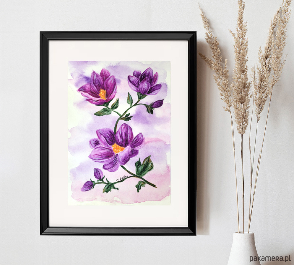 Piękny kwiat, który urozmaici każde wnętrze. Praca wykonana akwarelami oraz kredkami.