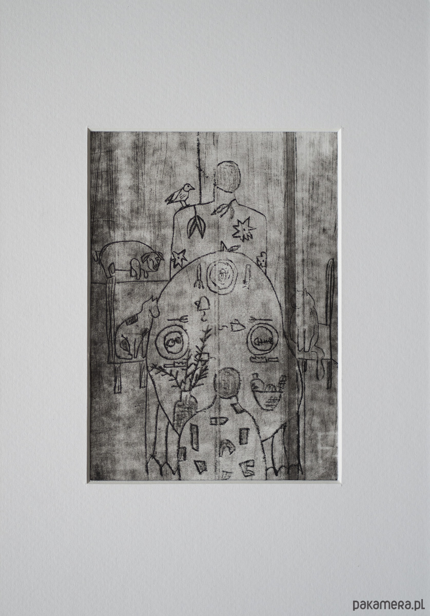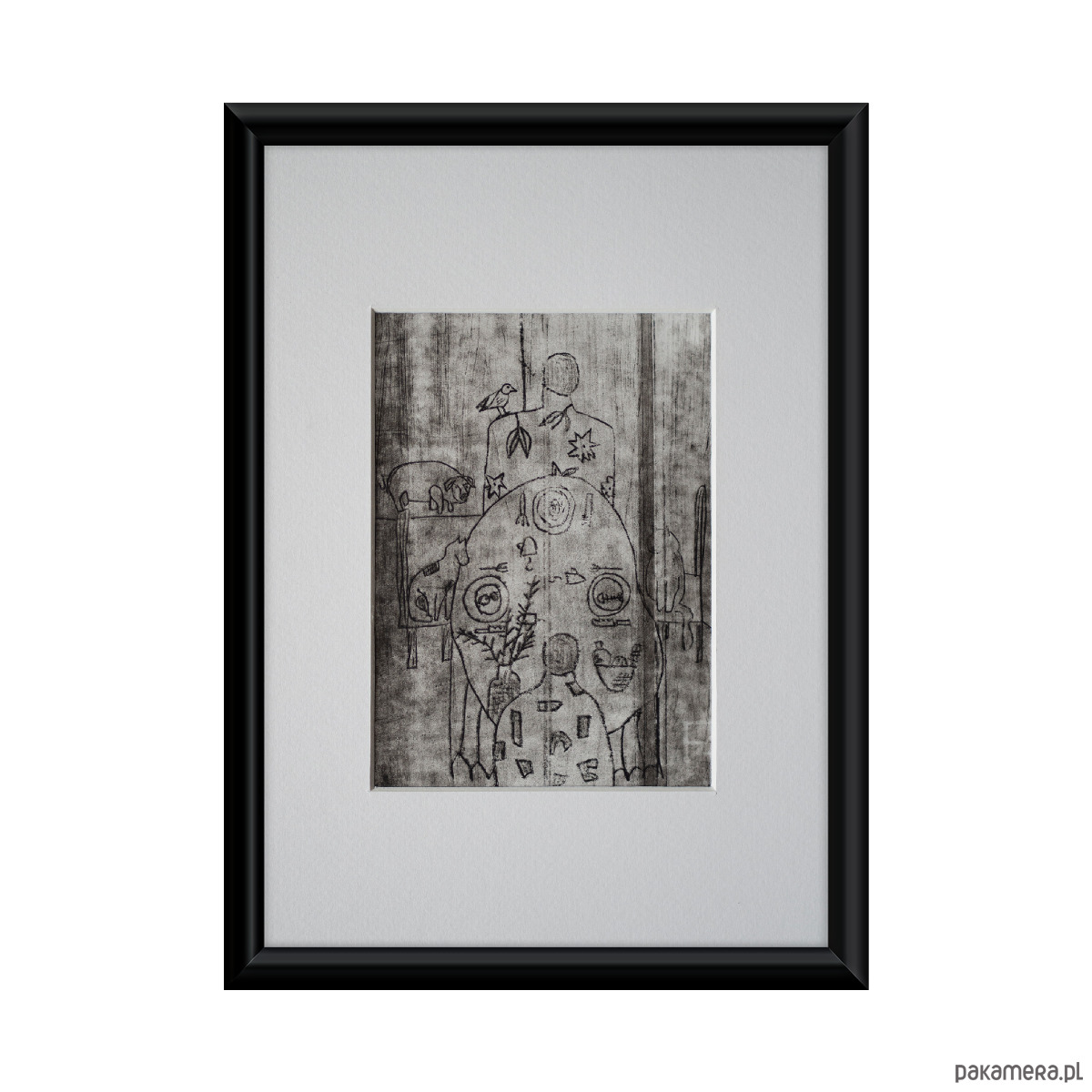 - grafika oprawiona w passe-partout o wymiarach 23 x 23 cm, okno 12 x 17 cm. Wystarczy włożyć do ramki.