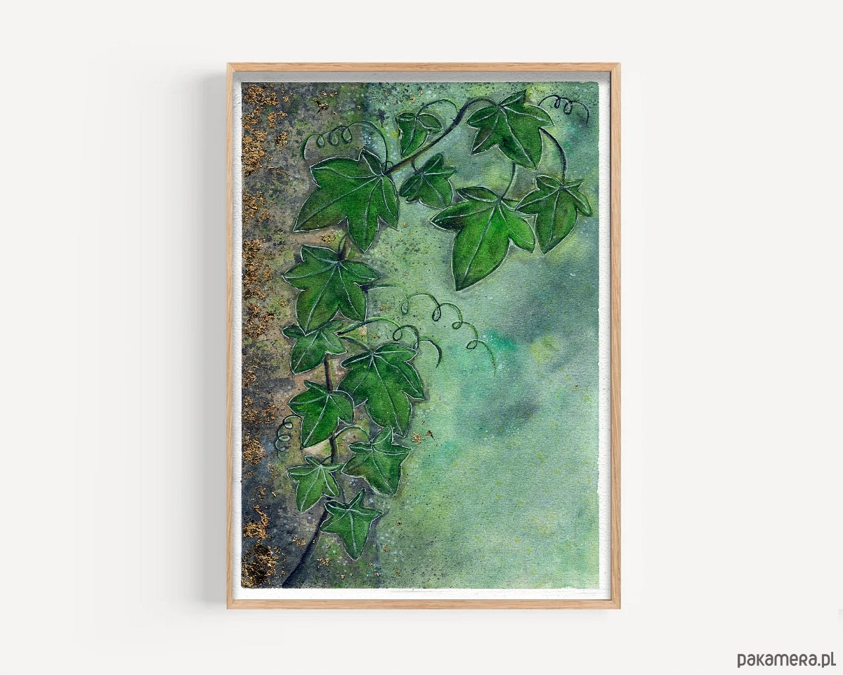 Oryginalna akwarela. Bluszcz ze złotą farbą A4