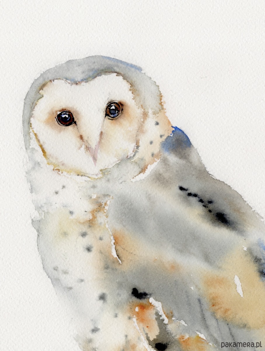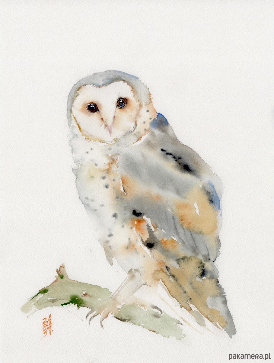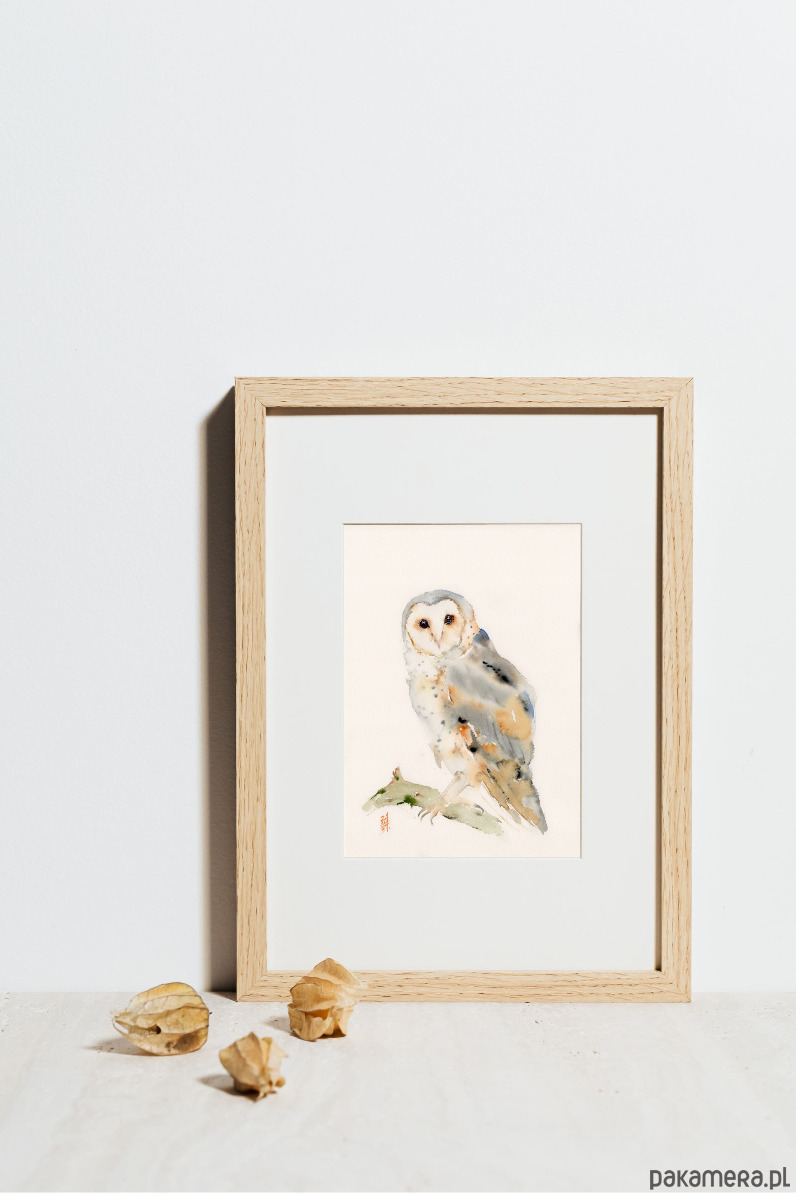Oryginalna akwarela. Sowa Płomykówka