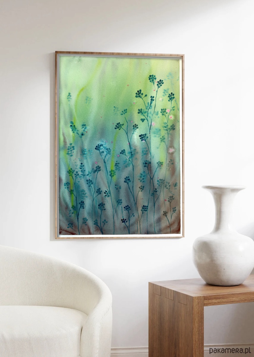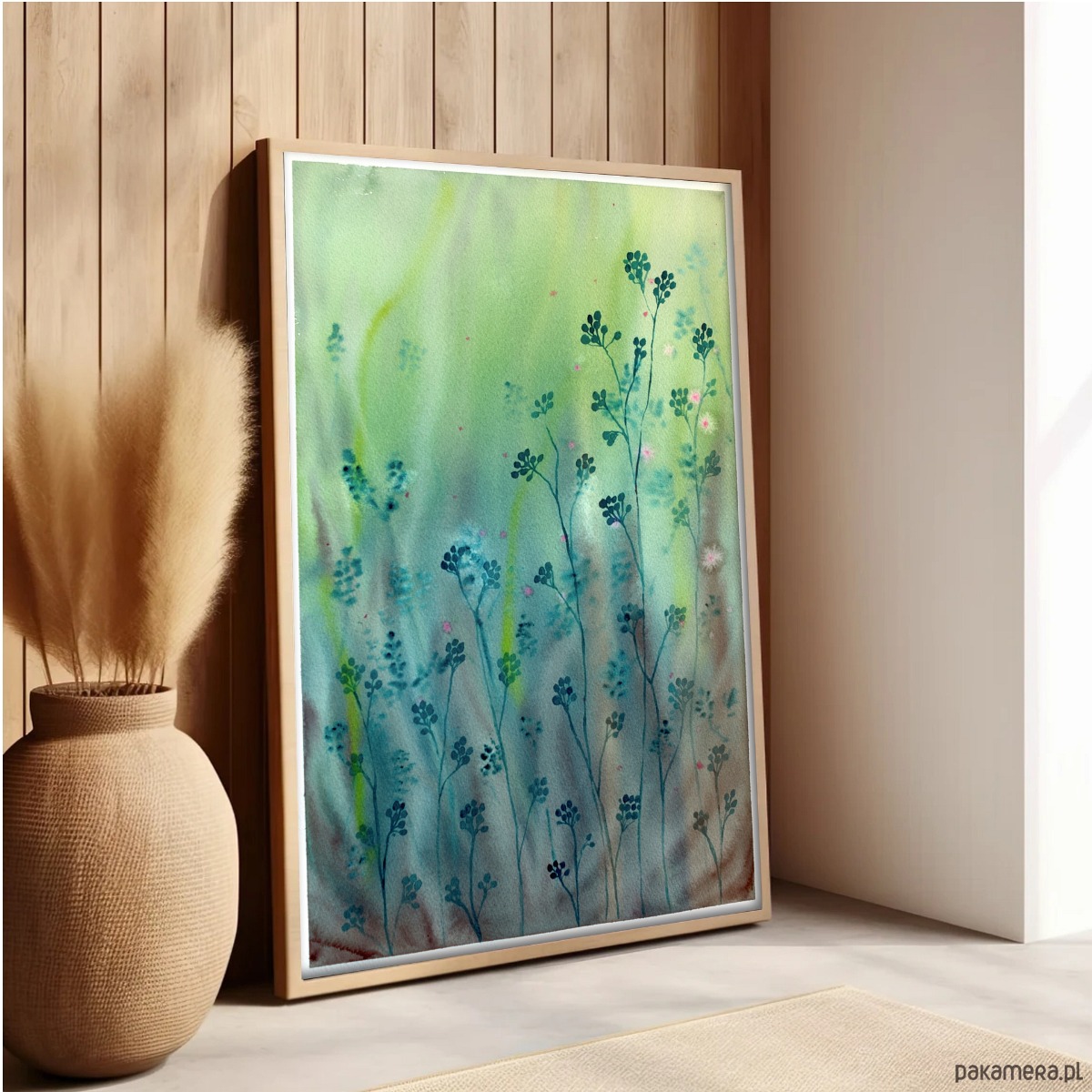 Oryginalna akwarela. Turkusowe kwiaty A3
