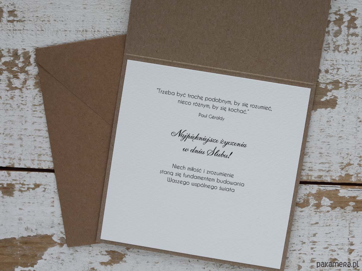 W środku wklejona jest jedna kartka z papieru bawełnianego z życzeniami bądź kartka pusta, gotowa do wpisania życzeń własnoręcznie.