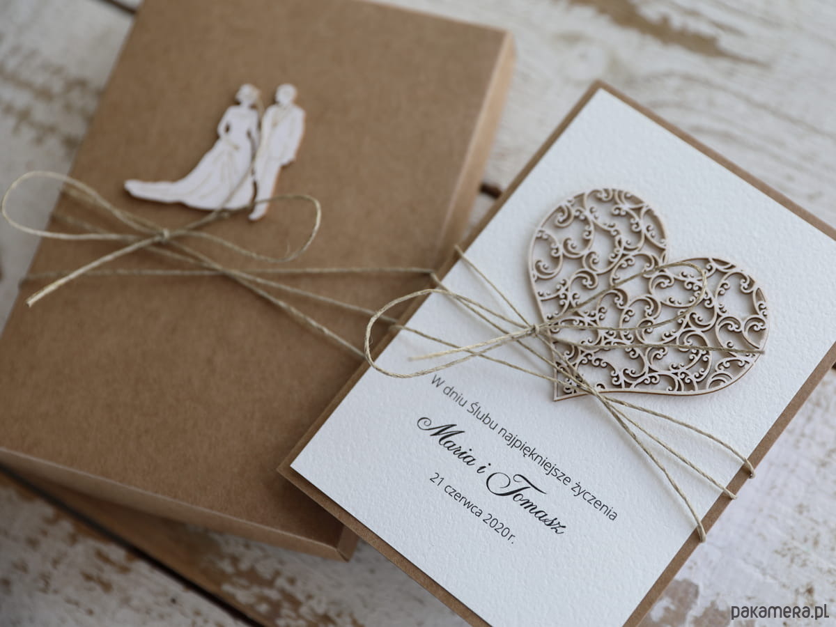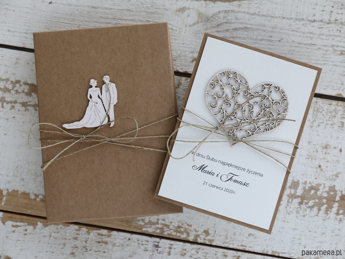 Kartka ślubna oraz pudełko przewiązane są lnianym sznureczkiem.