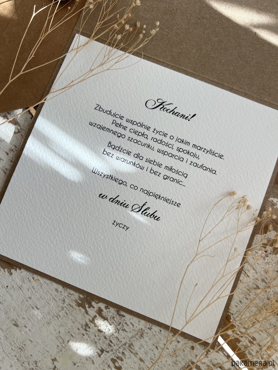 Rustykalna kartka na ślub handmade wykonana na bazie papieru kraftowego z użyciem starannie wyselekcjonowanego papieru czerpanego w kolorze ecri oraz ozdoby tekturkowej.