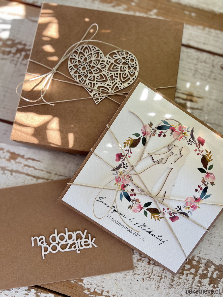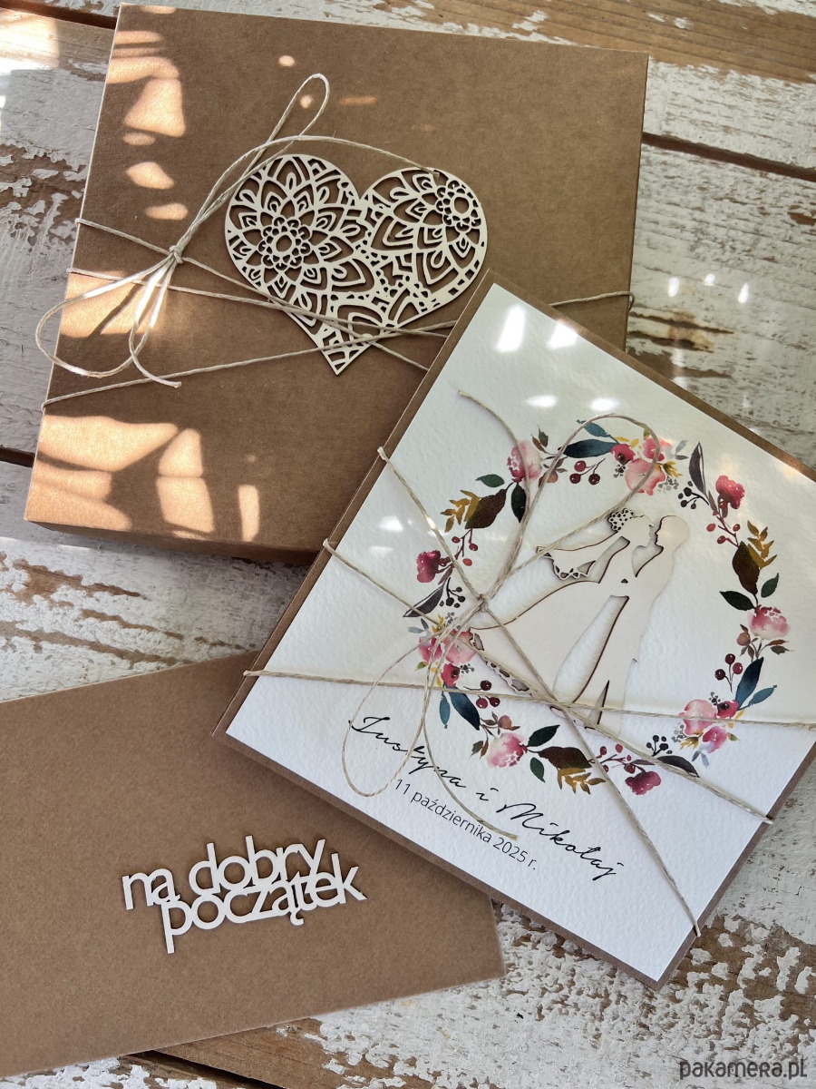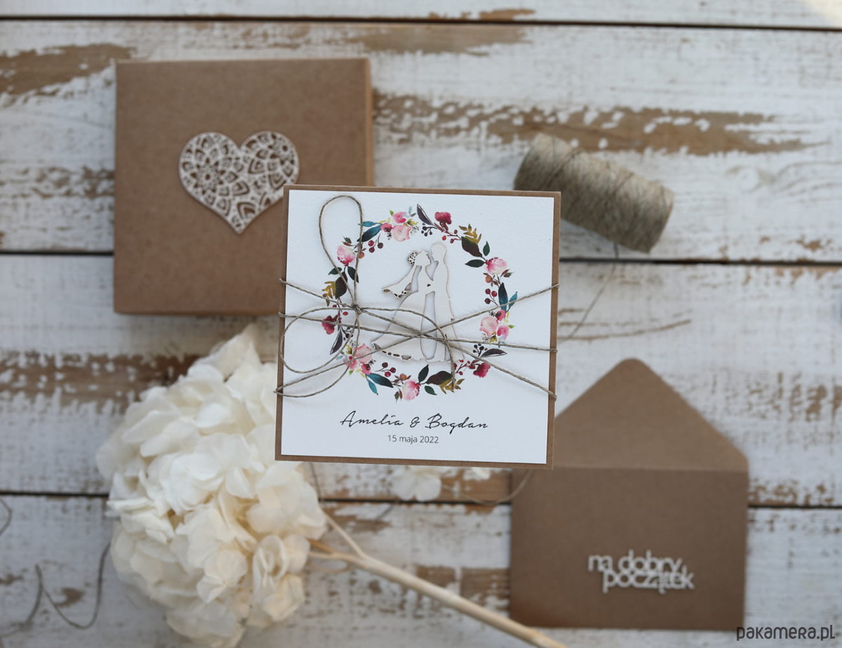 Oryginalna kartka ślubna z pudełkiem z wiankiem boho