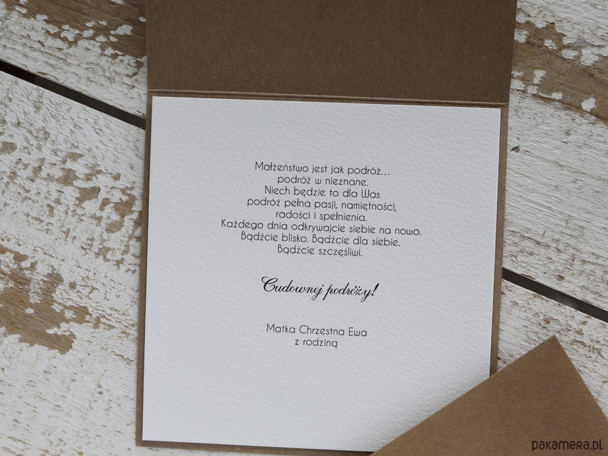Kartka na ślub o wymiarach ok. 14x14 cm wykonana jest z papieru kraftowego oraz papieru bawełnianego z użyciem ozdoby tekturkowej. Kartka otwierana do góry, w środku wklejona jest kartka z papieru bawełnianego z życzeniami bądź gotowa do wpisania życzeń własnoręcznie.