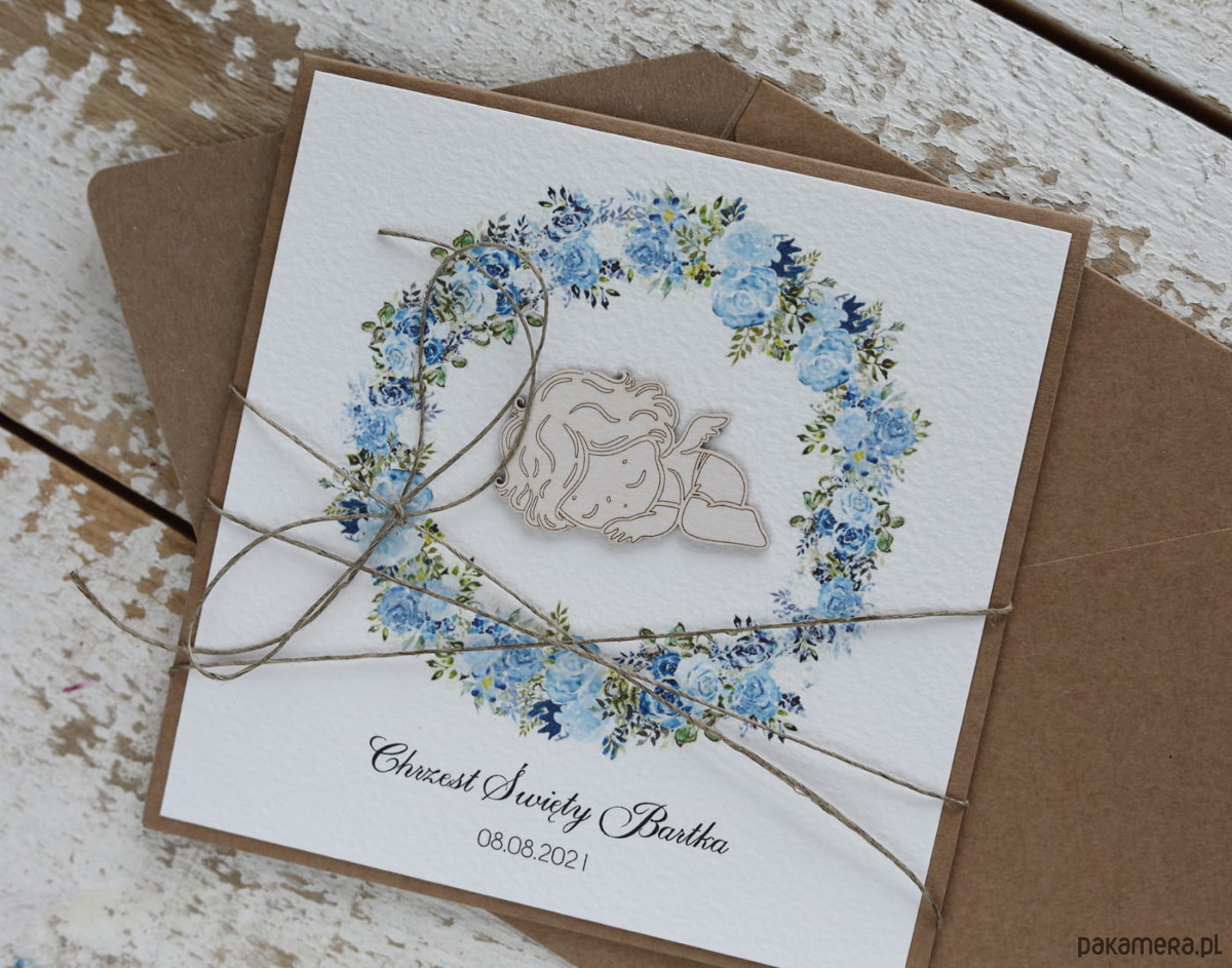 Rustykalna kartka na chrzest handmade wykonana na bazie papieru kraftowego z użyciem starannie wyselekcjonowanego papieru bawełnianego w kolorze ecri oraz tekturkowej ozdoby. Kartka otwierana jest do góry. Kartka przewiązana jest lnianym sznureczkiem.