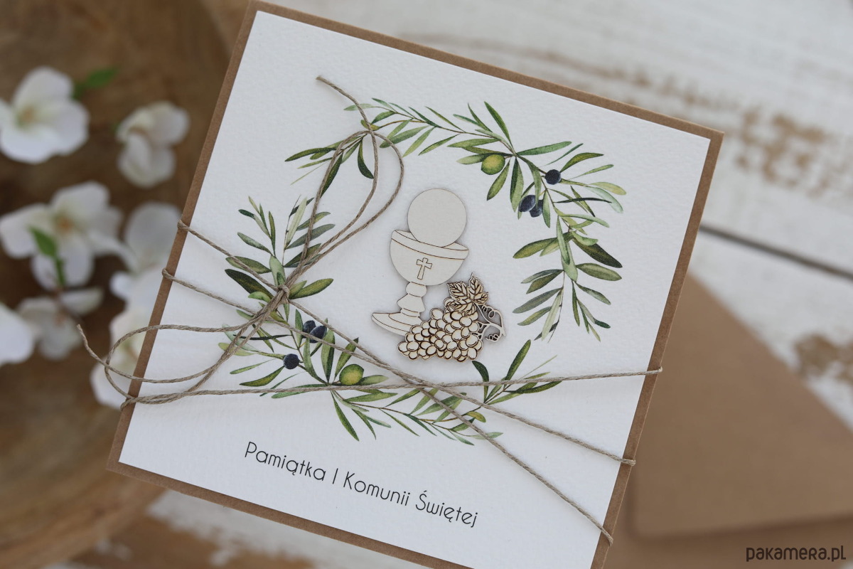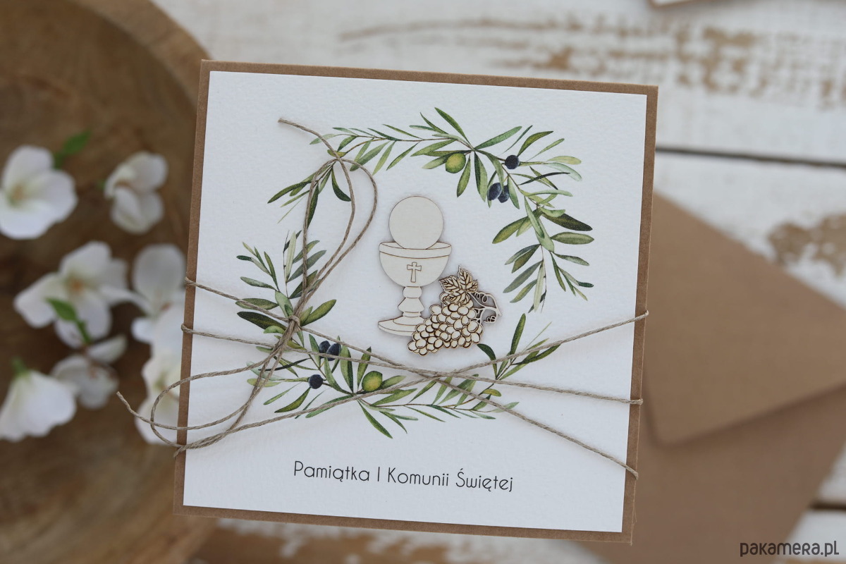 Oryginalna rustykalna kartka komunijna - Pierwsza Komunia Święta piękne życzenia