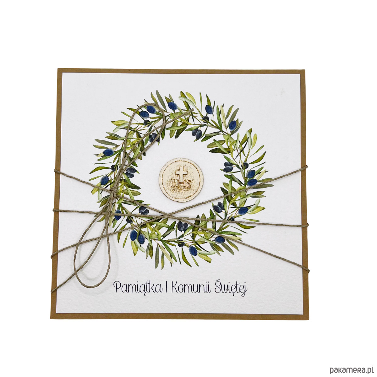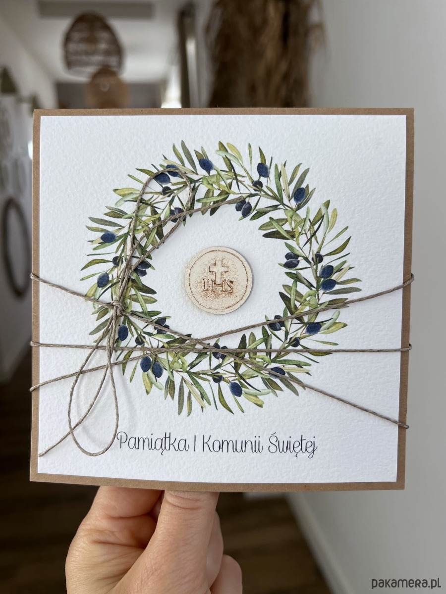 Oryginalna rustykalna kartka komunijna - Pierwsza Komunia Święta piękne życzenia