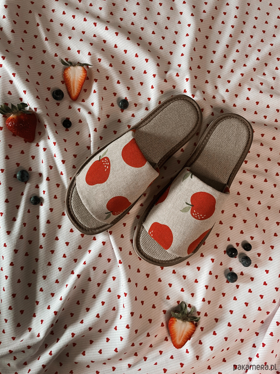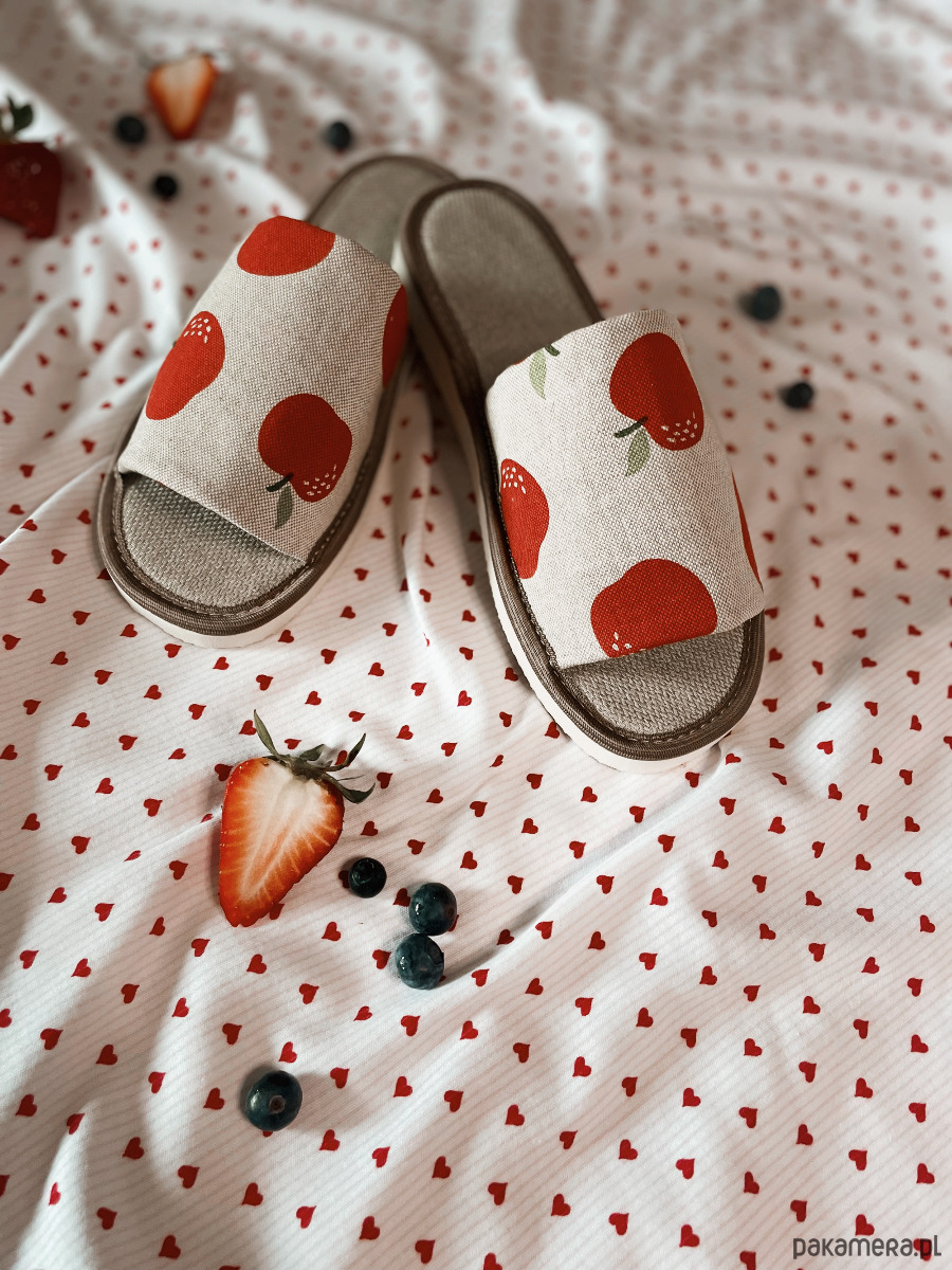 Te kapcie od razu przyciągają wzrok – soczysty wzór owoców na naturalnej tkaninie dodaje im lekkości, energii i dziewczęcego uroku.