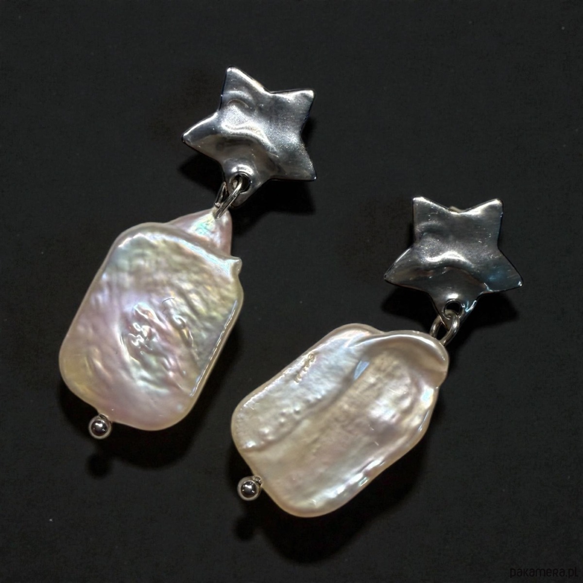 Oryginalne kolczyki z perłą słodkowodną zawieszoną na gwiazdce ze stali chirurgicznej.