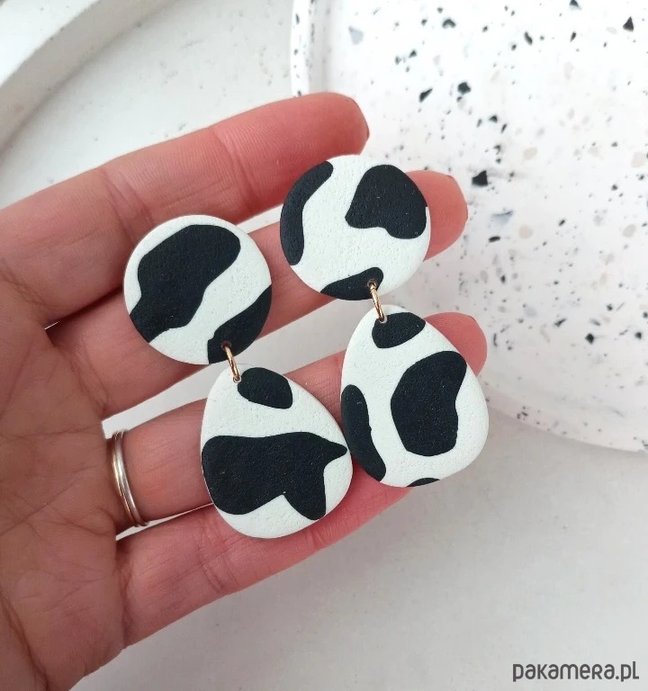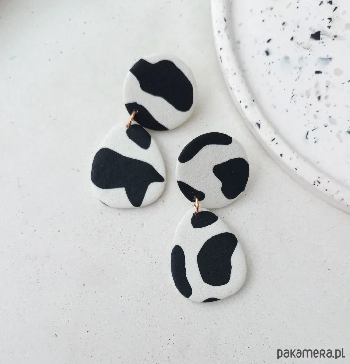 Oryginalne kolczyki wykonane ręcznie z dbałością o szczegóły z profesjonalnej glinki polimerowej, wypalane w piecu i szlifowane w domowej pracowni. Każda para kolczyków jest niepowtarzalna i wyjątkowa. Kolczyki są bardzo lekkie i wygodne, nie obciążają płatka ucha i przyciągają spojrzenia. Zapinane na sztyft ze stali chirurgicznej.