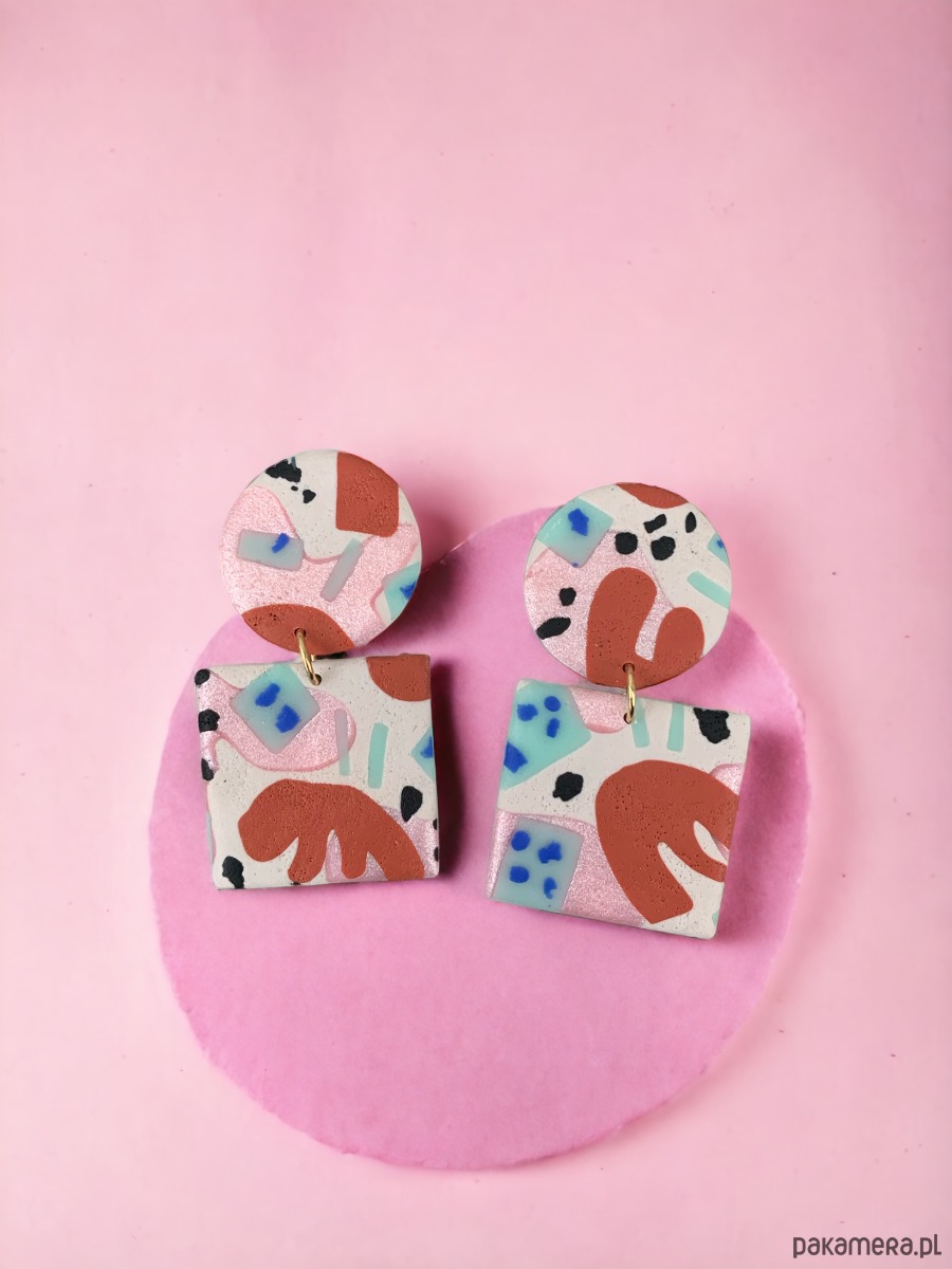 Oryginalne kolczyki wykonane ręcznie z dbałością o szczegóły z profesjonalnej glinki polimerowej, wypalane w piecu i szlifowane w domowej pracowni. Każda para kolczyków jest niepowtarzalna i wyjątkowa. Kolczyki są bardzo lekkie i wygodne, nie obciążają płatka ucha i przyciągają spojrzenia. Zapinane na sztyft ze stali chirurgicznej.