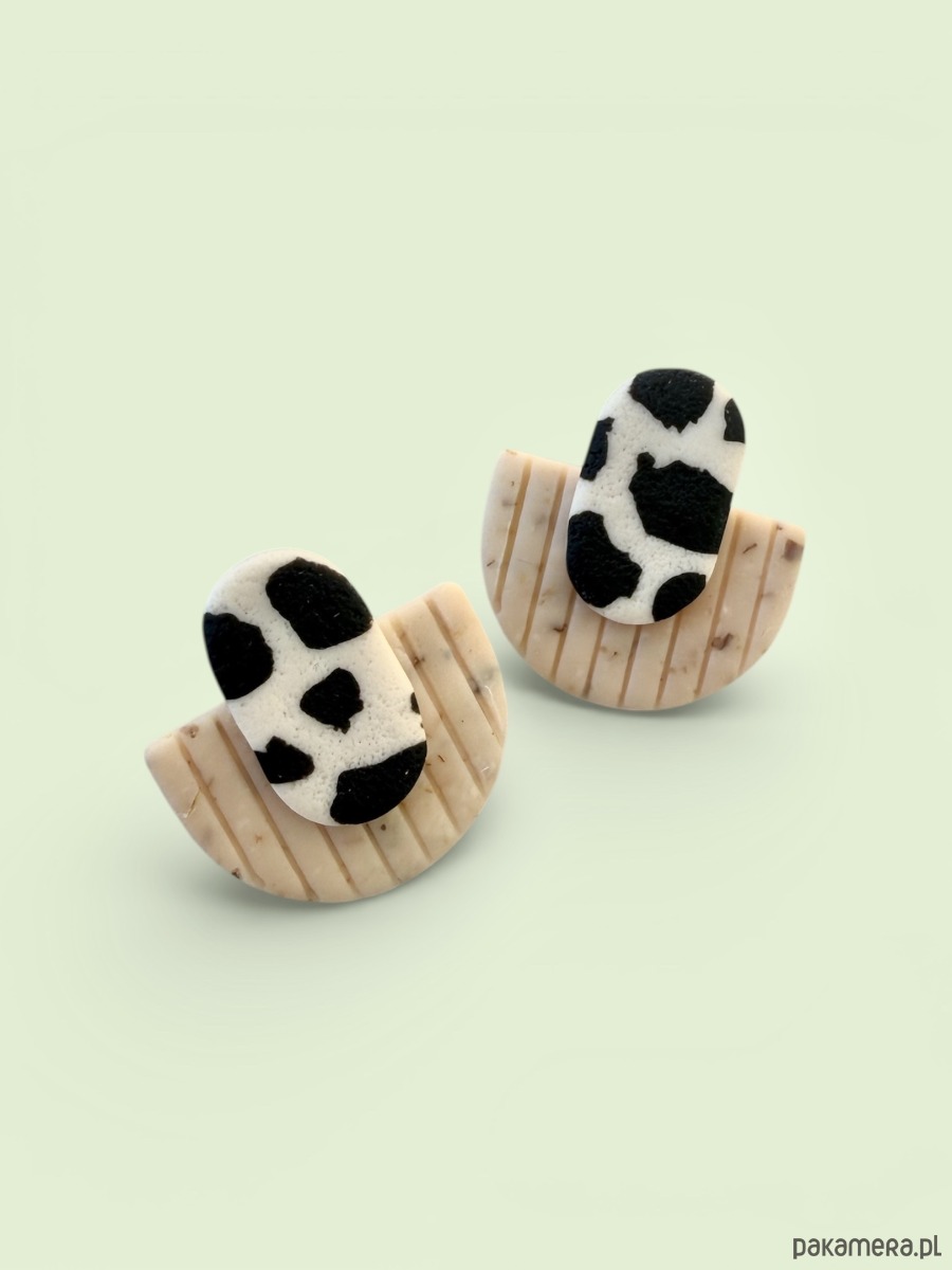 Oryginalne kolczyki wykonane ręcznie z dbałością o szczegóły z profesjonalnej glinki polimerowej, wypalane w piecu i szlifowane w domowej pracowni. Każda para kolczyków jest niepowtarzalna i wyjątkowa. Kolczyki są bardzo lekkie i wygodne, nie obciążają płatka ucha i przyciągają spojrzenia. Zapinane na kółeczko ze stali chirurgicznej.