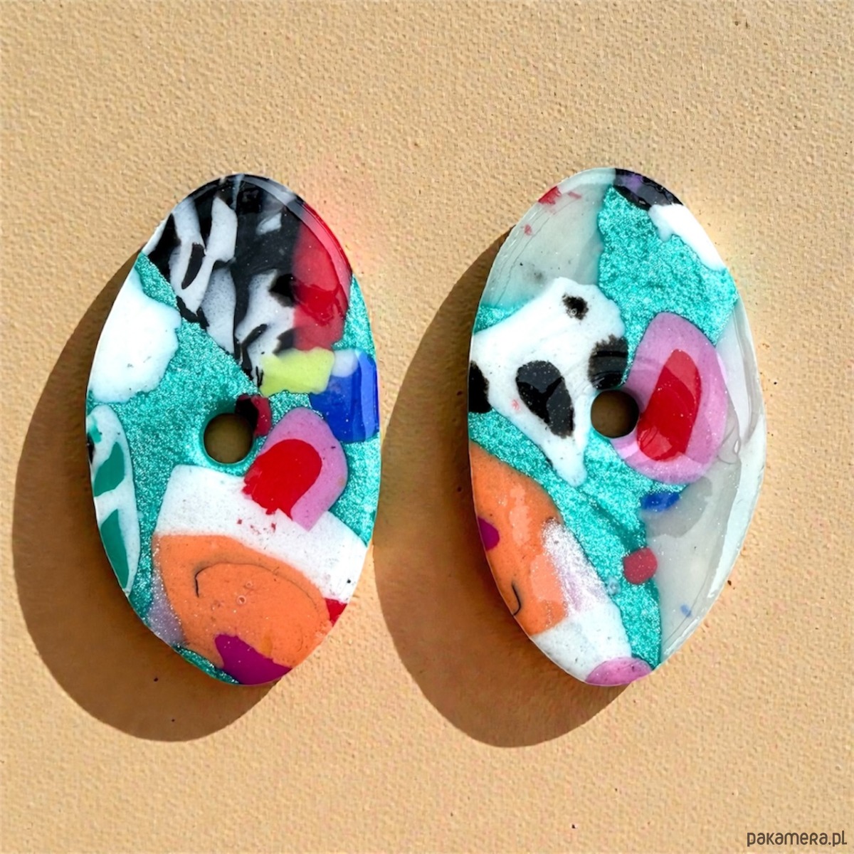 Oryginalne kolczyki wykonane ręcznie z dbałością o szczegóły z profesjonalnej glinki polimerowej, wypalane w piecu i szlifowane w domowej pracowni. Każda para kolczyków/klipsow jest niepowtarzalna i wyjątkowa. Kolczyki są bardzo lekkie i wygodne, nie obciążają płatka ucha i przyciągają spojrzenia. Zapinane na sztyft ze stali chirurgicznej.