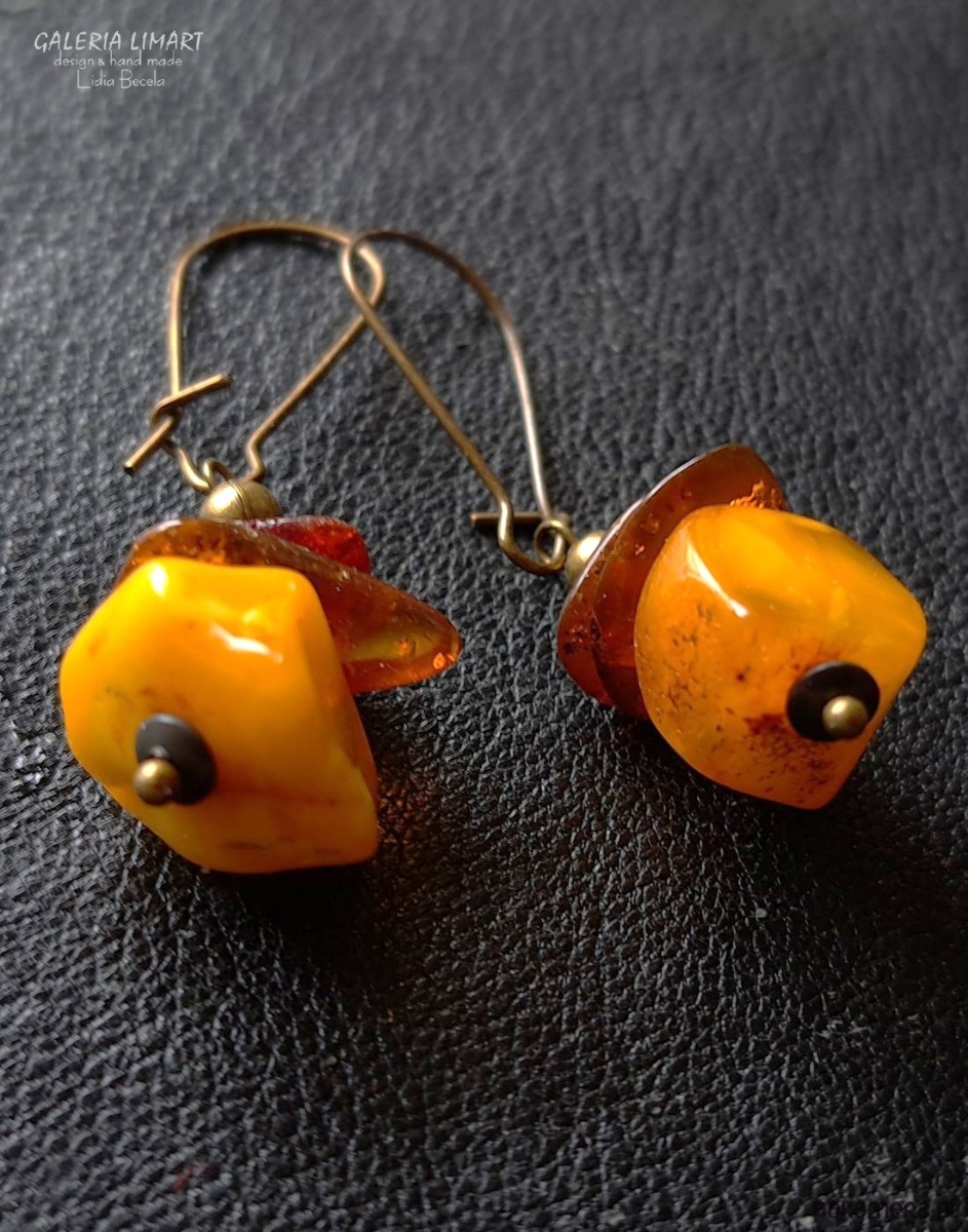 Oryginalne kolczyki z bursztynów bałtyckich mlecznego i koniakowego Prezent