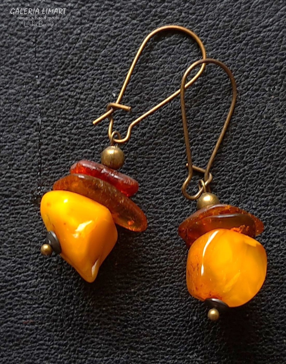 Zawsze modne i efektowne kolczyki z prawdziwego surowego mlecznego bursztynu bałtyckiego w cudnym, ciepłym słonecznym kolorze i mniejszych bursztynów w koniakowym kolorze na długich bezpiecznych biglach. Długość ok. 4 cm.