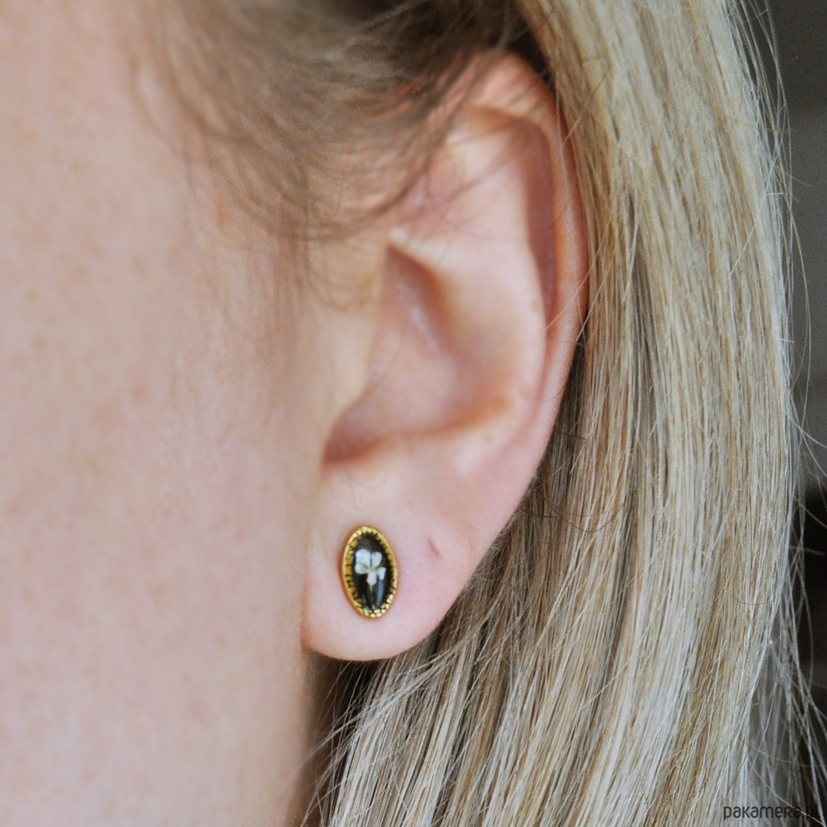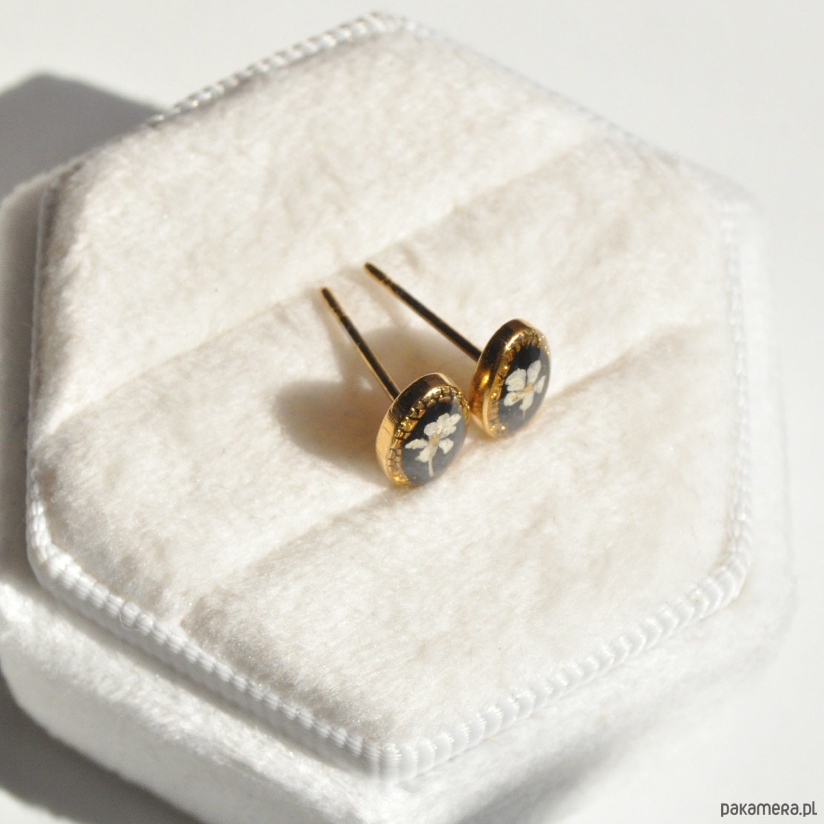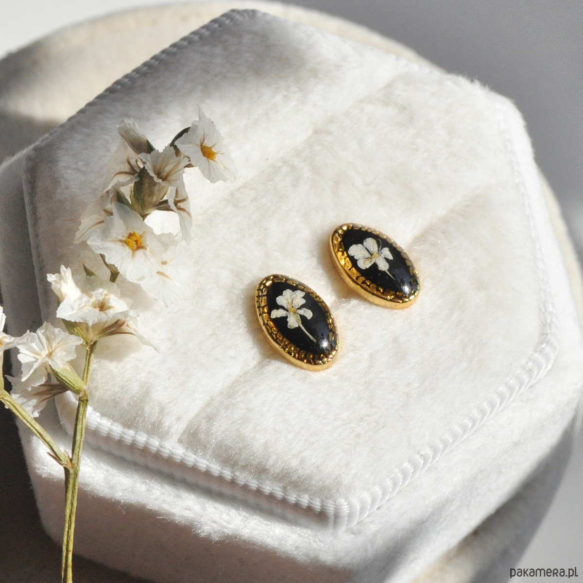 Oryginalne kolczyki wykonane ze stali chirurgicznej i żywicy epoksydowej. W kolczykach zostały zatopione kwiaty dzikiej marchwi.