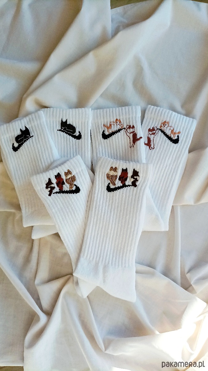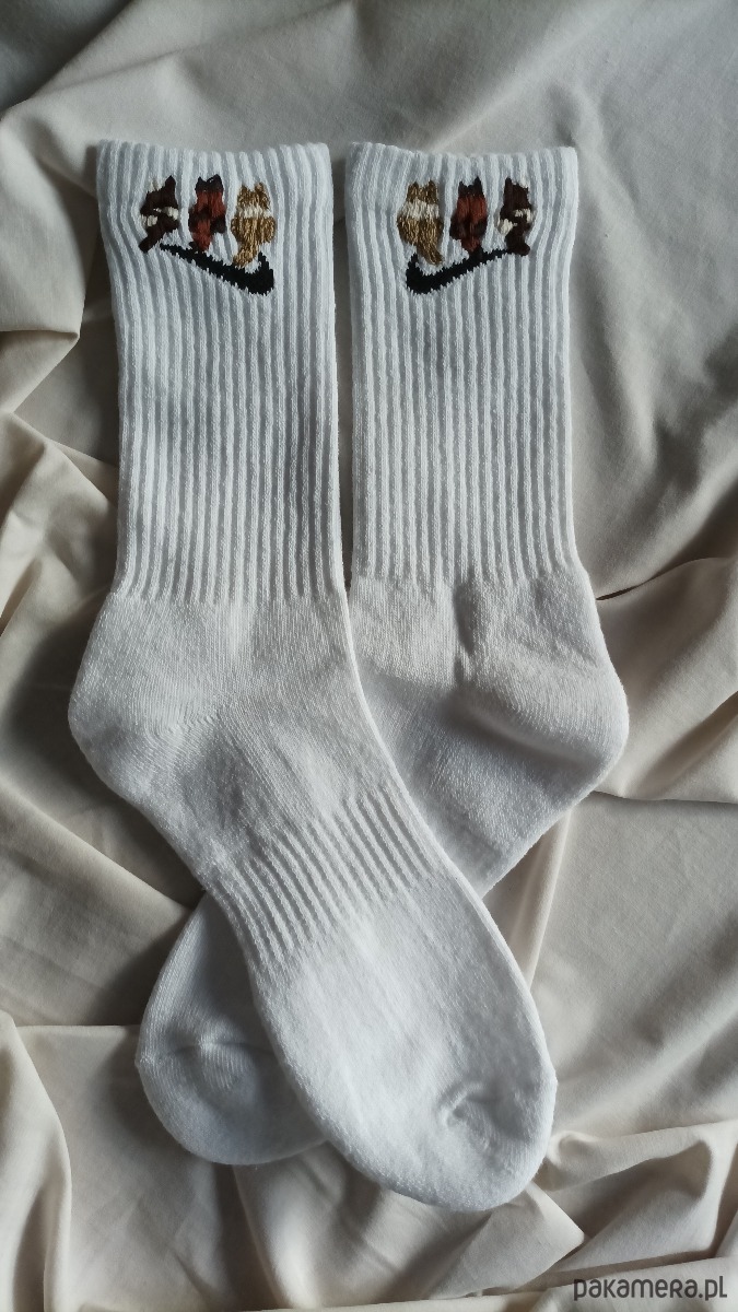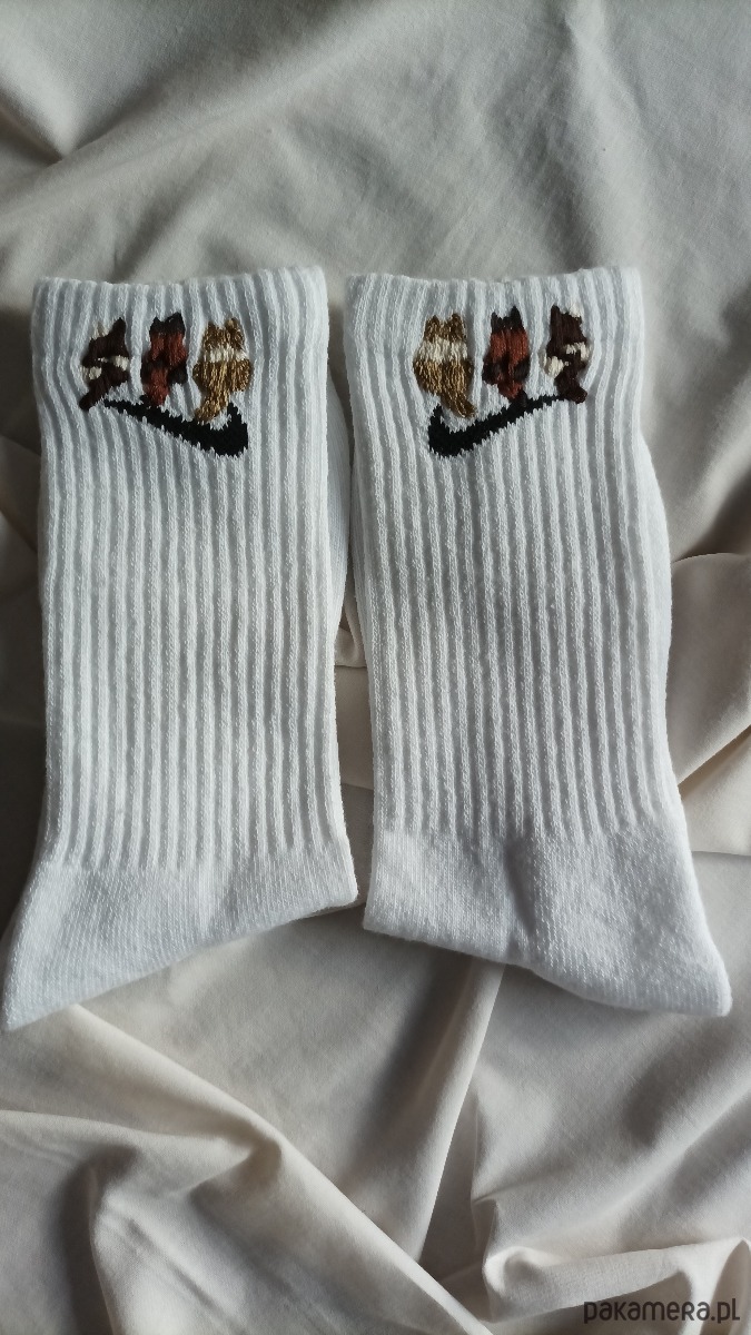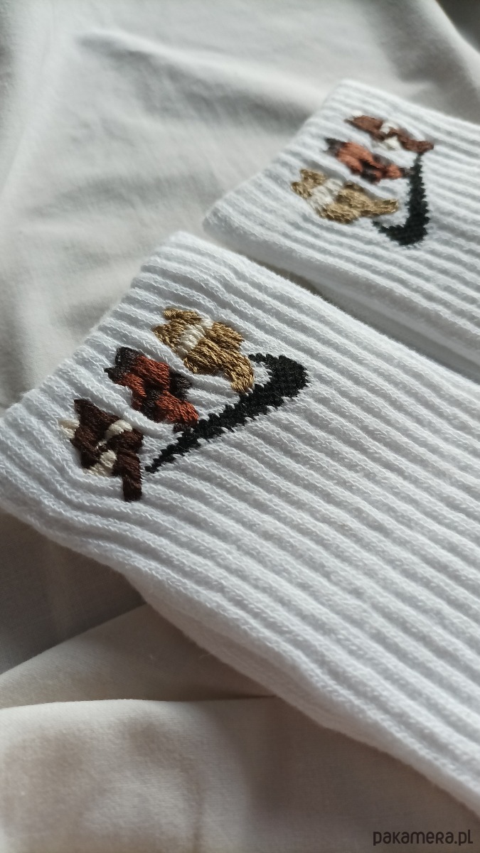 Białe skarpetki Nike z haftem ręcznym, wykonane z zadbaniem o każdy szczegół.
