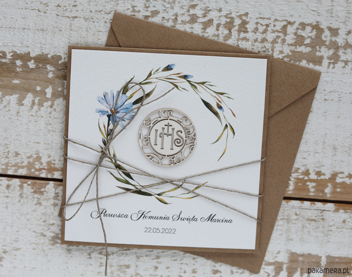 Wyjątkowe, oryginalne i eleganckie zaproszenia komunijne, wykonane z papieru kraftowego i bawełnianego. Wymiary ok. 14x14 cm. W zestawie z brązową kopertą.