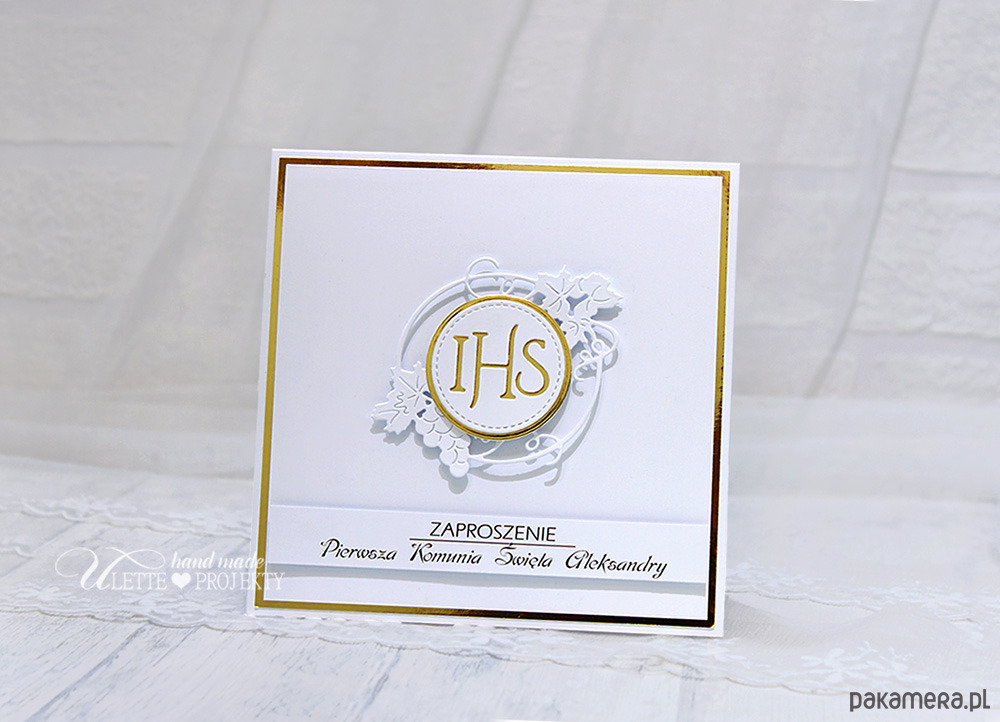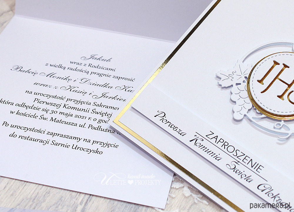 Eleganckie, ręcznie robione zaproszenie na komunię. Wszystkie użyte papiery, to wysokiej jakości papiery wizytówkowe od polskich producentów zapewniają odpowiednią jakość produktu. Elementy są wycinane i wytłaczane ręcznie za pomocą specjalnych narzędzi. Niektóre wykonane są z lustrzanego złotego papieru delikatnie mieniąc się w zależności od kąta nachylenia.