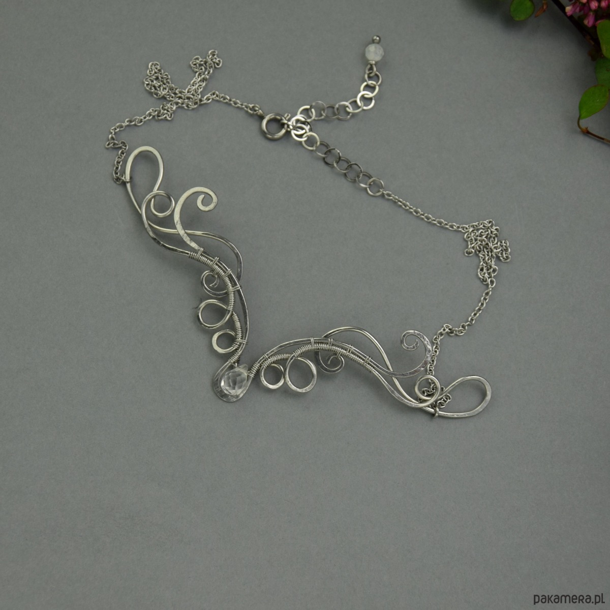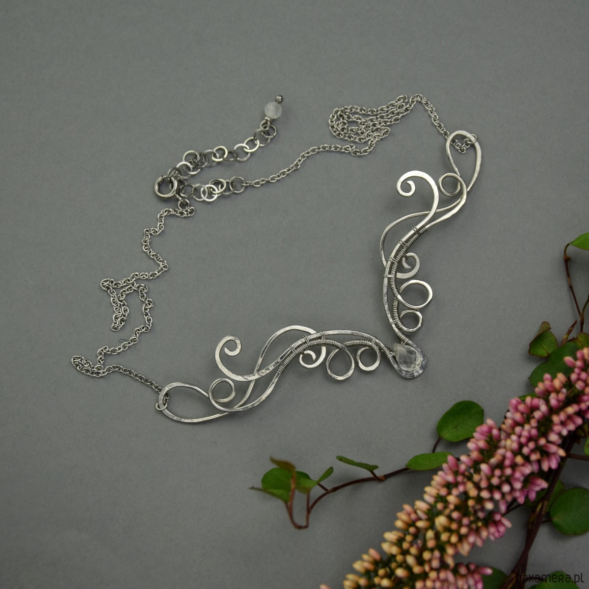 Fantazyjny, ręcznie wykonany naszyjnik z kryształem górskim. Naszyjnik wykonany został techniką wire wrapping z drutów ze stali chirurgicznej. Druty zostały częściowo spłaszczone za pomocą młotka.