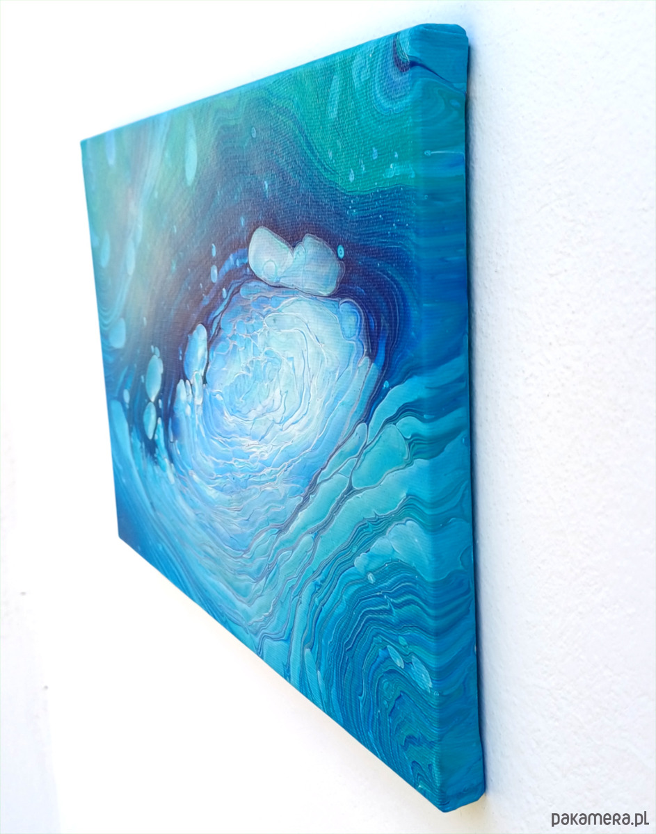 Technika: acrylic pouring. Obraz powstał bez użycia pędzla, przez manipulowanie płynną farbą na płótnie. Uzyskiwane tą techniką magiczne kolory i fantastyczne, baśniowe kształty są widoczne nie tylko na froncie ale również na bokach/brzegach, dlatego warto powiesić go na ścianie nie oprawiając w ramę.