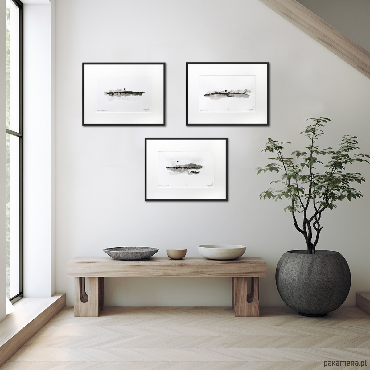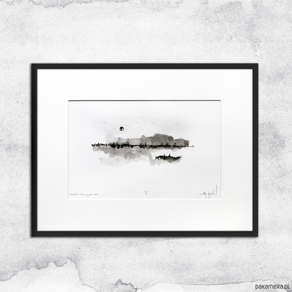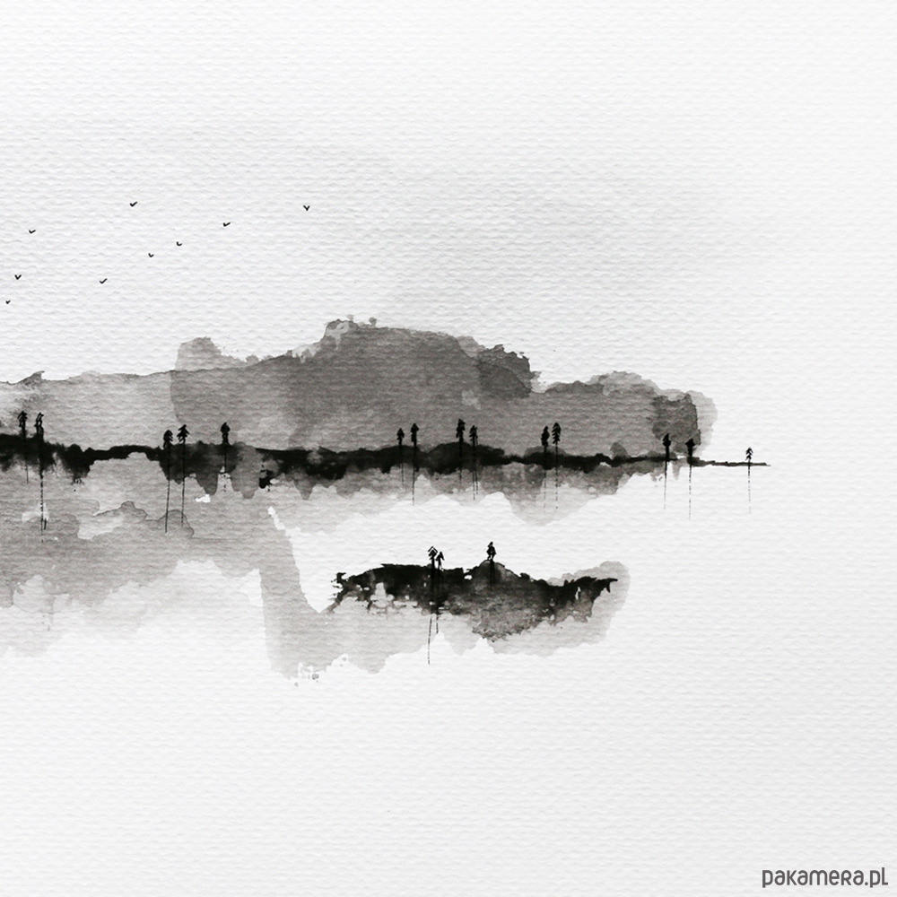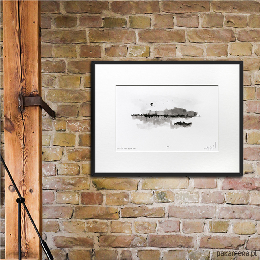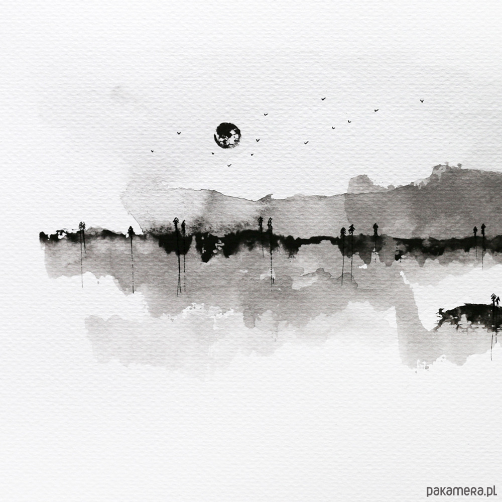 Minimalistyczny obraz akwarelowy przedstawia nastrojowy pejzaż. Sylwetki drzew i ptaków wykonane są tuszem za pomocą cienkiego piórka. Każda z prac wykonana jest w pojedynczym egzemplarzu. Subtelny charakter grafik wpasuje się zarówno do klasycznych jak i nowoczesnych wnętrz.