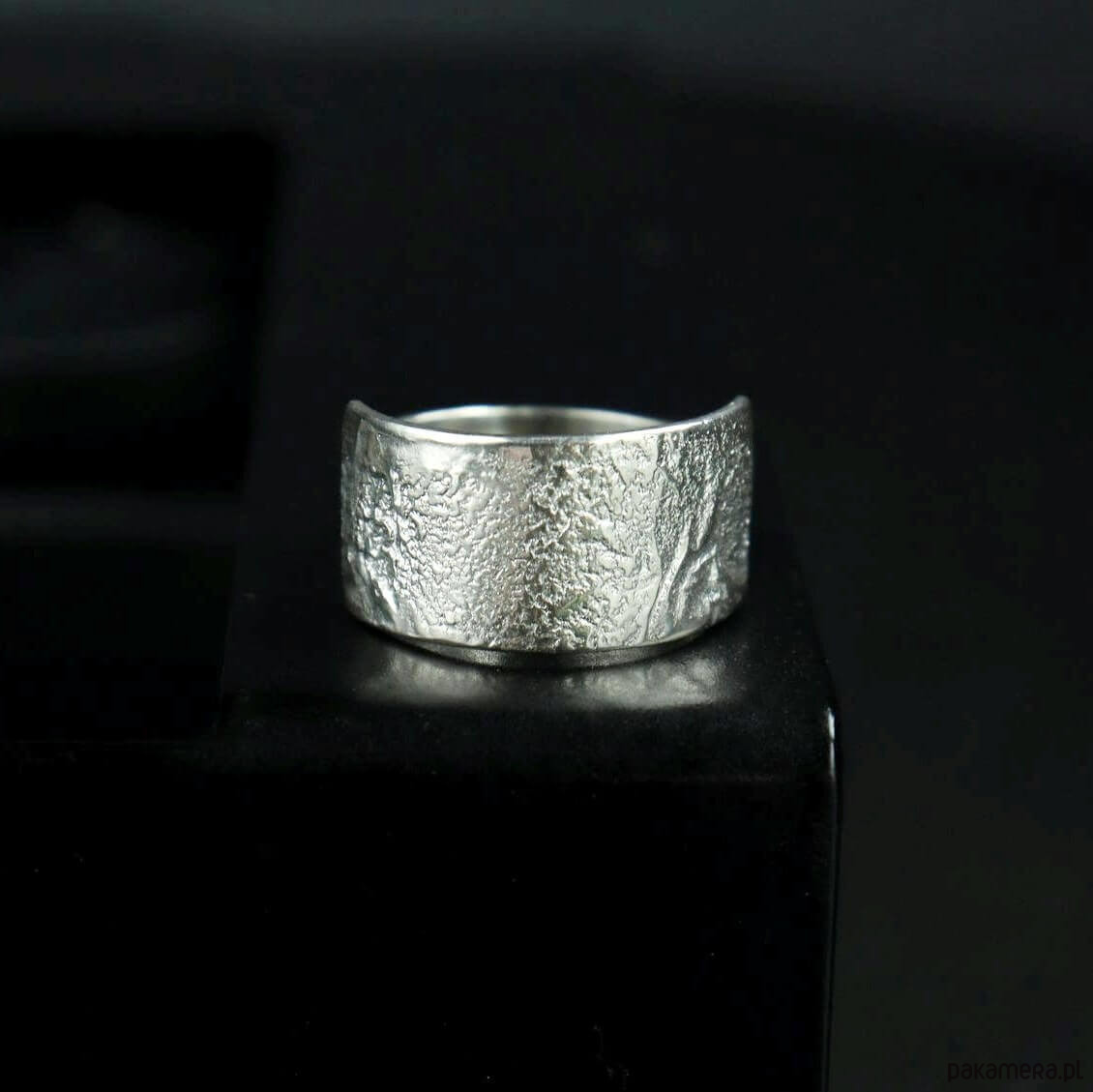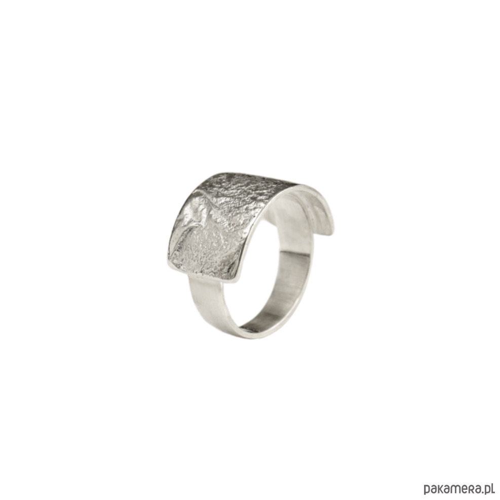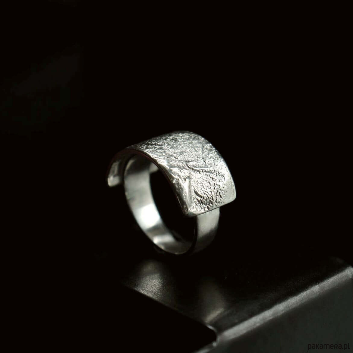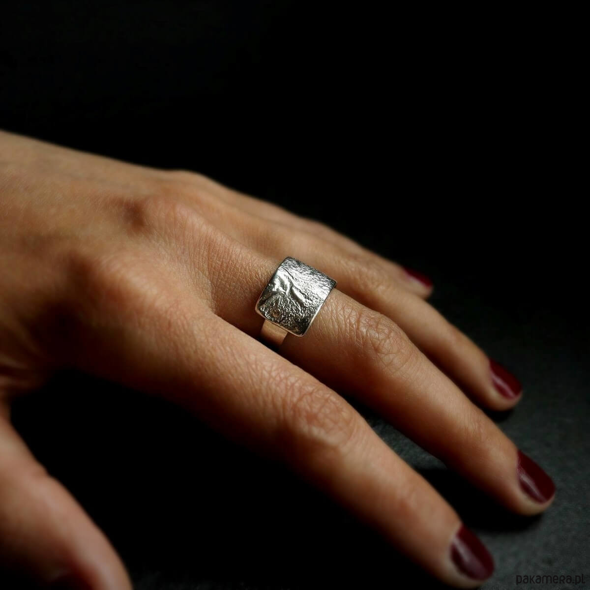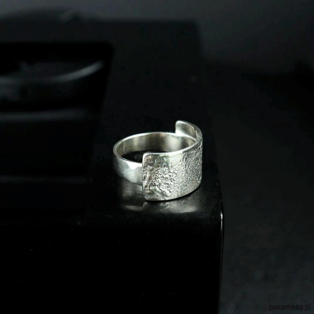 Oryginalny pierścionek prostokątny to połączenie bardzo surowej powierzchni figury geometrycznej z gładką wypolerowaną powierzchnią rozszerzanej obrączki. Super wygodny model, idealny dla kobiet pragnących mieć w swojej szkatułce szeroki designerski pierścionek, ale miewają problem z szerokimi modelami (np. przeszkadzają przy zginaniu palca). W tym pierścionku na pewno poczują się komfortowo. Biżuteria wykonana ręcznie ze srebra pr. 925.