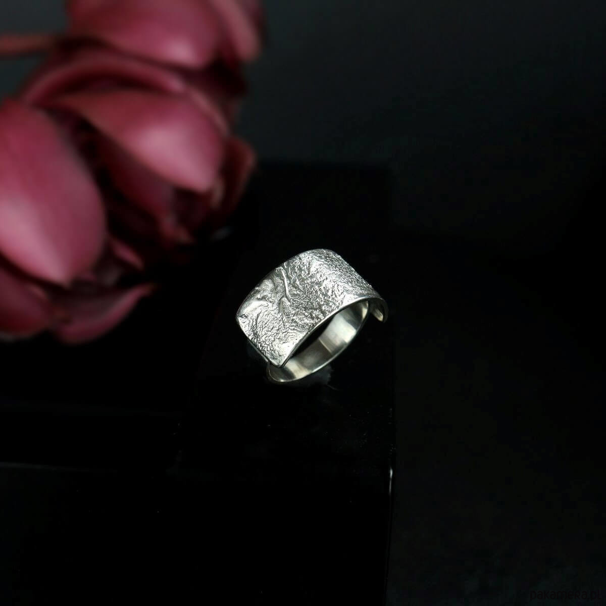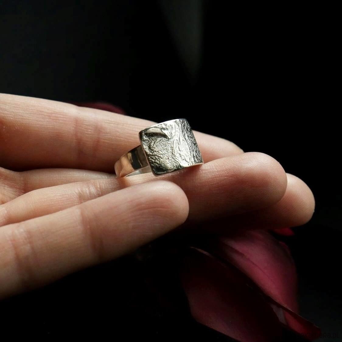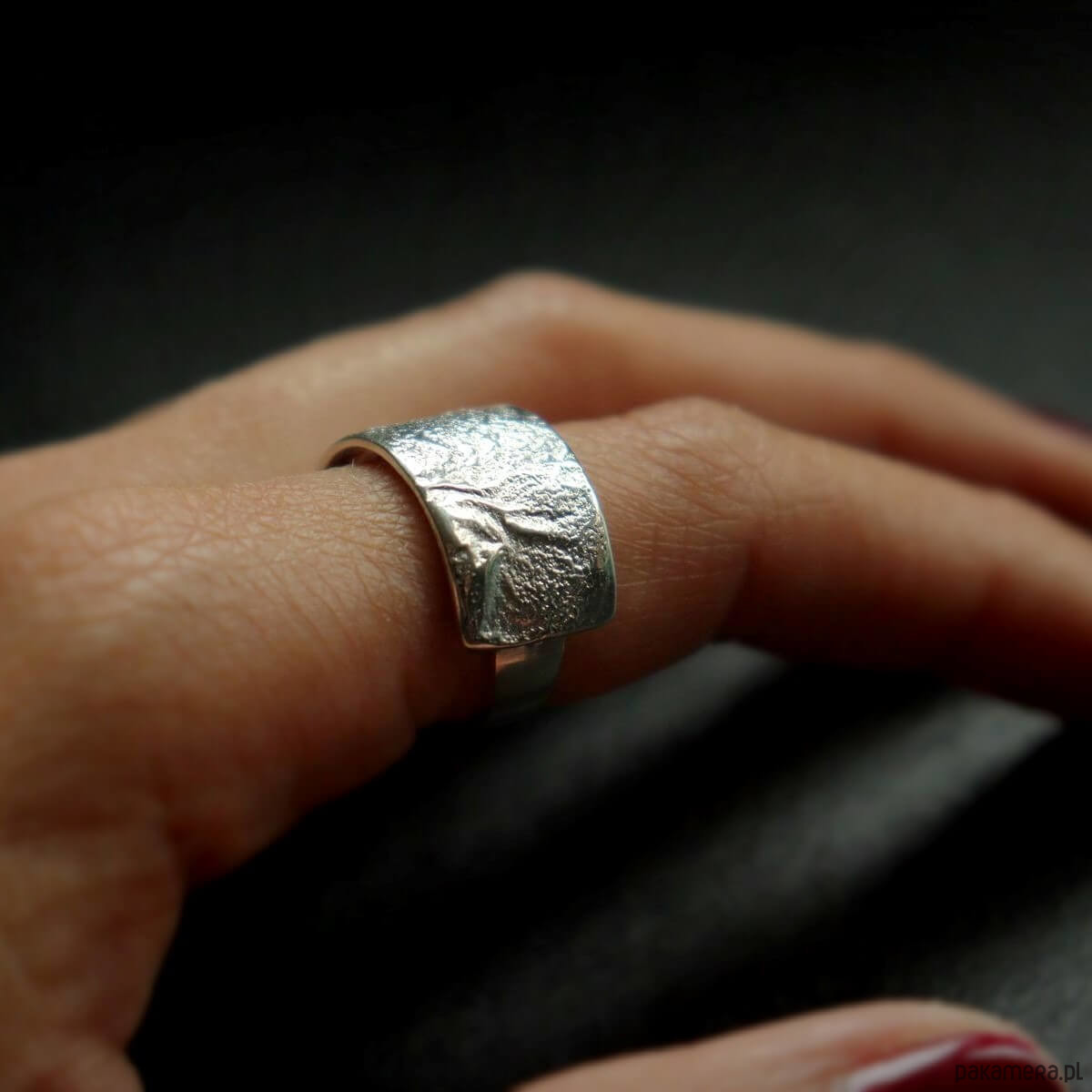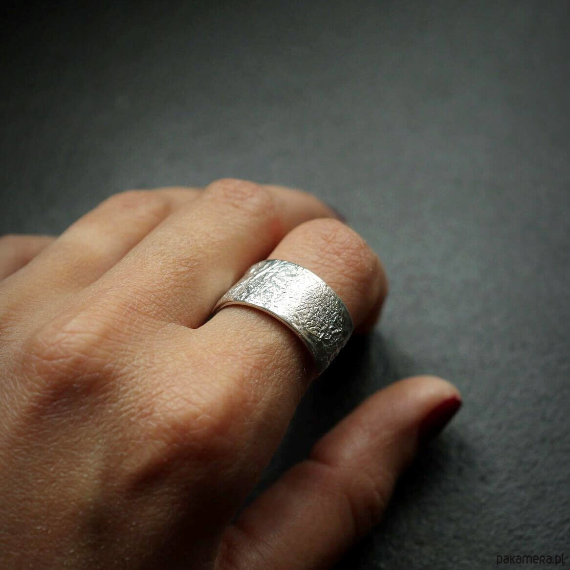 Oryginalny pierścionek prostokątny to połączenie bardzo surowej powierzchni figury geometrycznej z gładką wypolerowaną powierzchnią rozszerzanej obrączki. Super wygodny model, idealny dla kobiet pragnących mieć w swojej szkatułce szeroki designerski pierścionek, ale miewają problem z szerokimi modelami (np. przeszkadzają przy zginaniu palca). W tym pierścionku na pewno poczują się komfortowo. Biżuteria wykonana ręcznie ze srebra pr. 925.