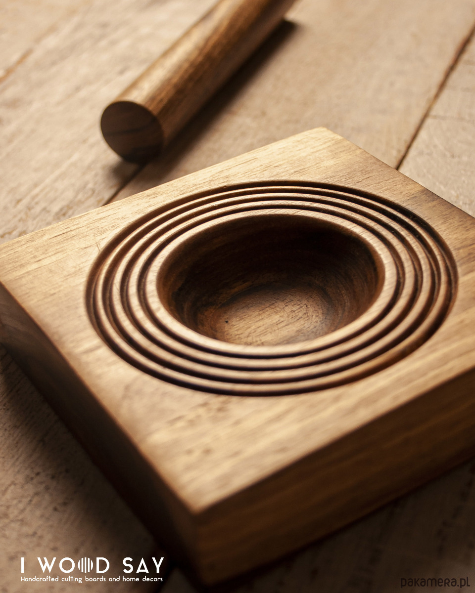 Zestaw jest rzeźbiony w drewnie orzecha włoskiego.