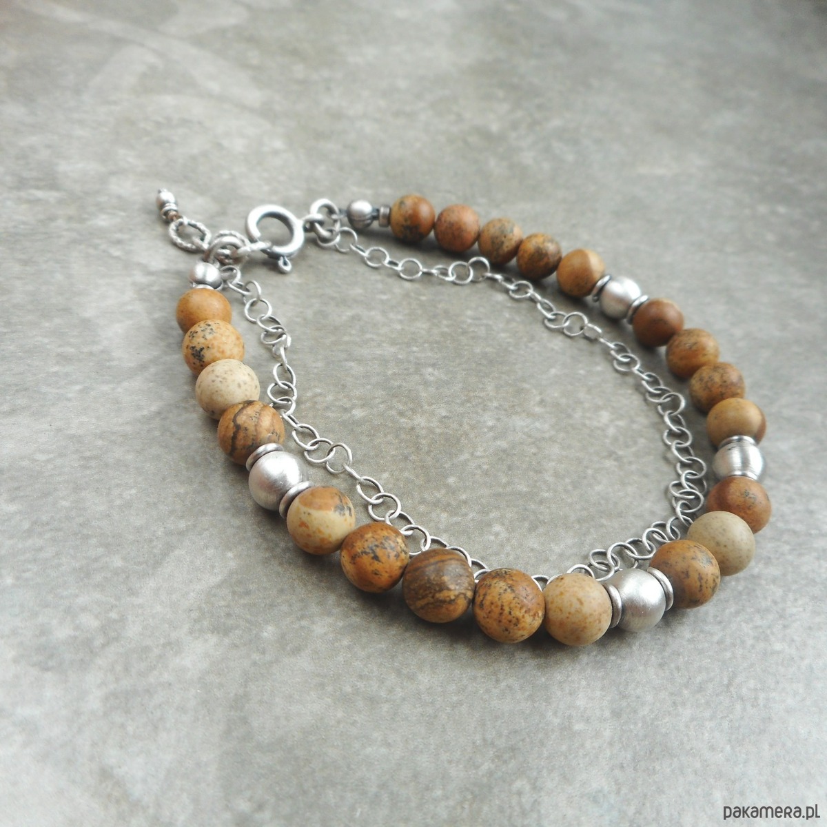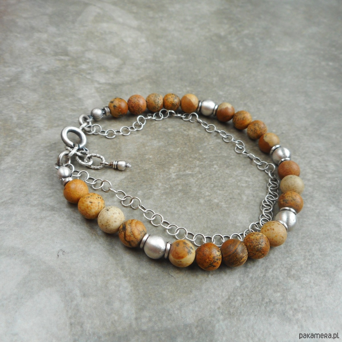 Wyjątkowa bransoletka z kamieni naturalnych i szlachetnego srebra; klasyczna i elegancka, z pięknymi jesiennymi matowymi jaspisami. Do kompletu polecam kolczyki dostępne w mojej galerii.