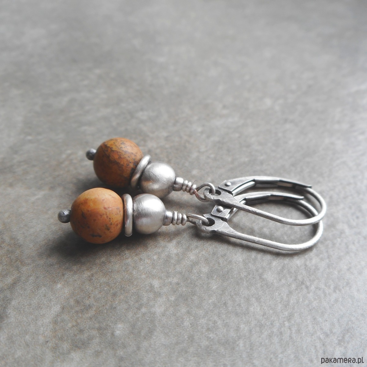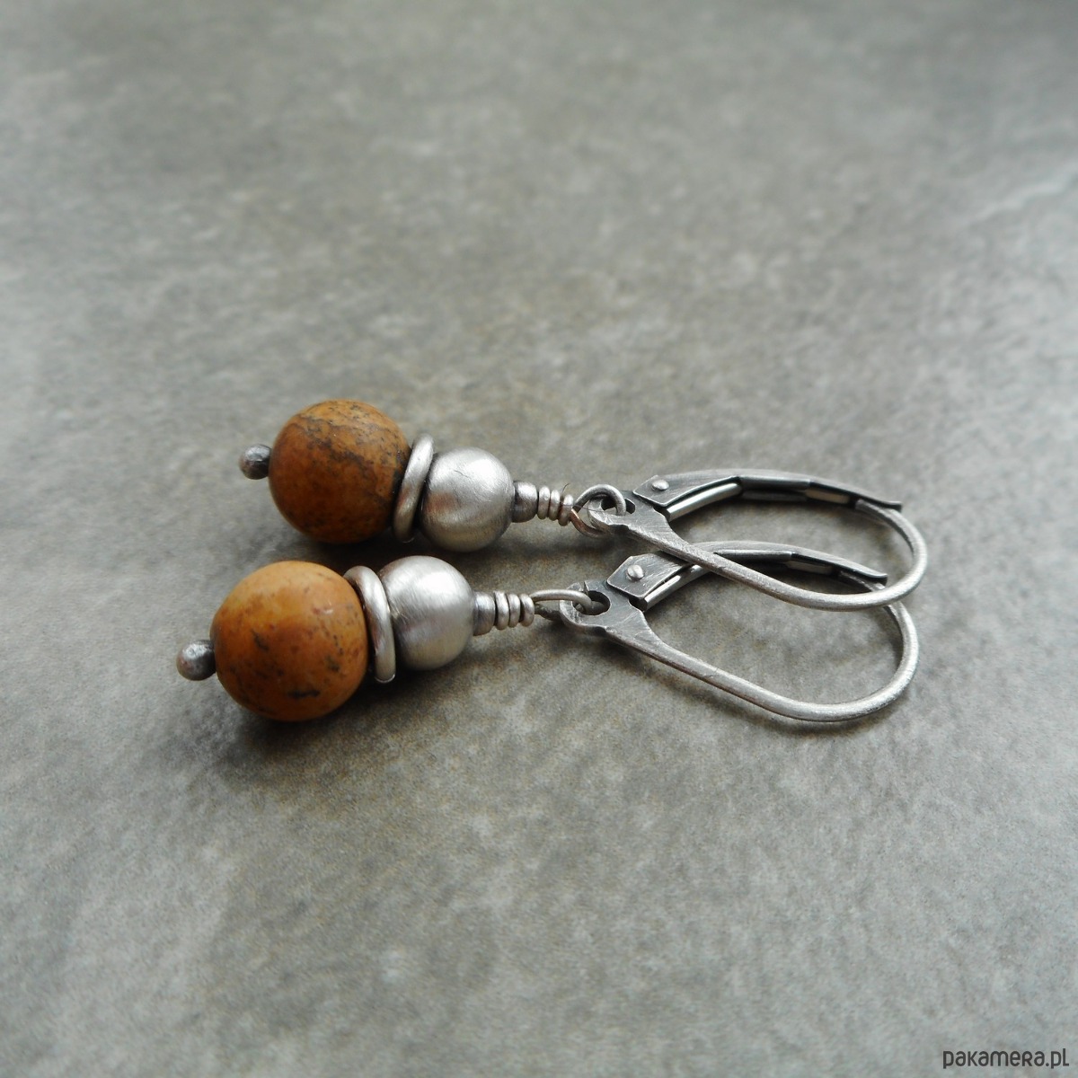 Nieduże kolczyki z kamieni naturalnych i szlachetnego srebra; kamienie w orzechowym odcieniu brązu.