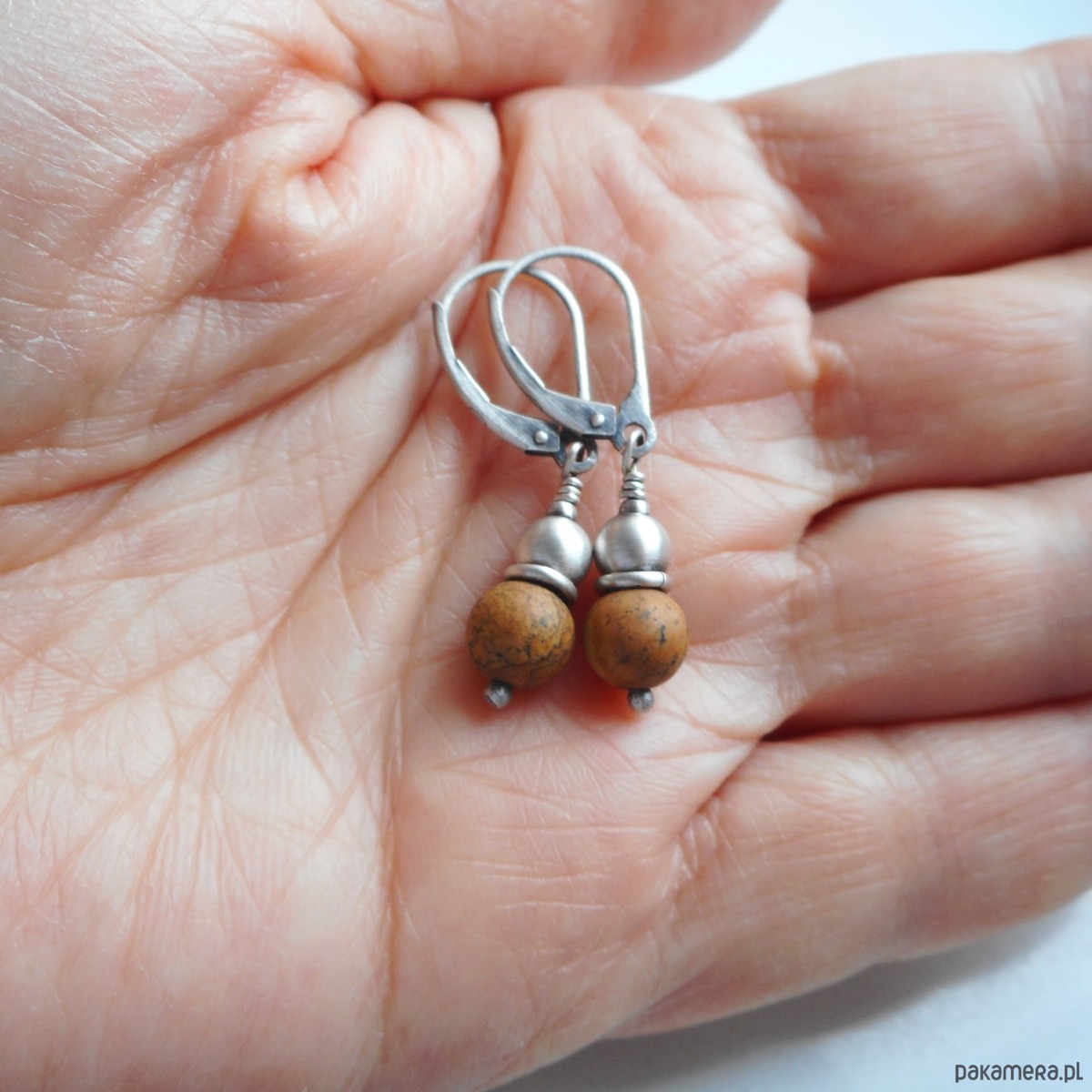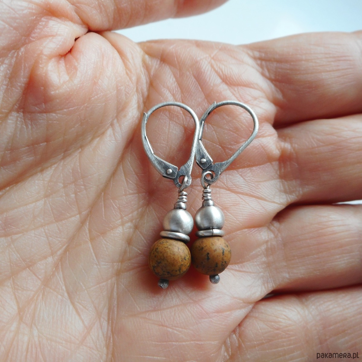 Nieduże kolczyki z kamieni naturalnych i szlachetnego srebra; kamienie w orzechowym odcieniu brązu.