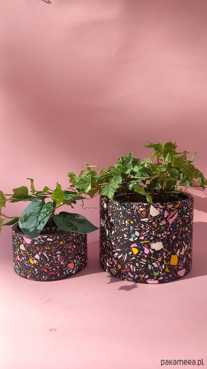 Czarna osłonka na doniczkę / pojemnik terazzo to przepiękny i unikatowy dodatek do mieszkania.