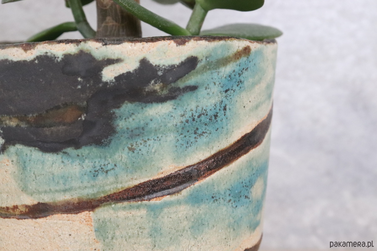 Osłonka wykonana z jasnej gliny, zdobiona szkliwem ciemnobrązowym oraz niebiesko-zielonym z przebarwieniami. Naczynie zostało wykonane ręcznie, bez użycia koła garncarskiego.